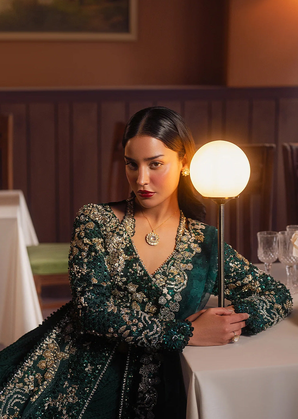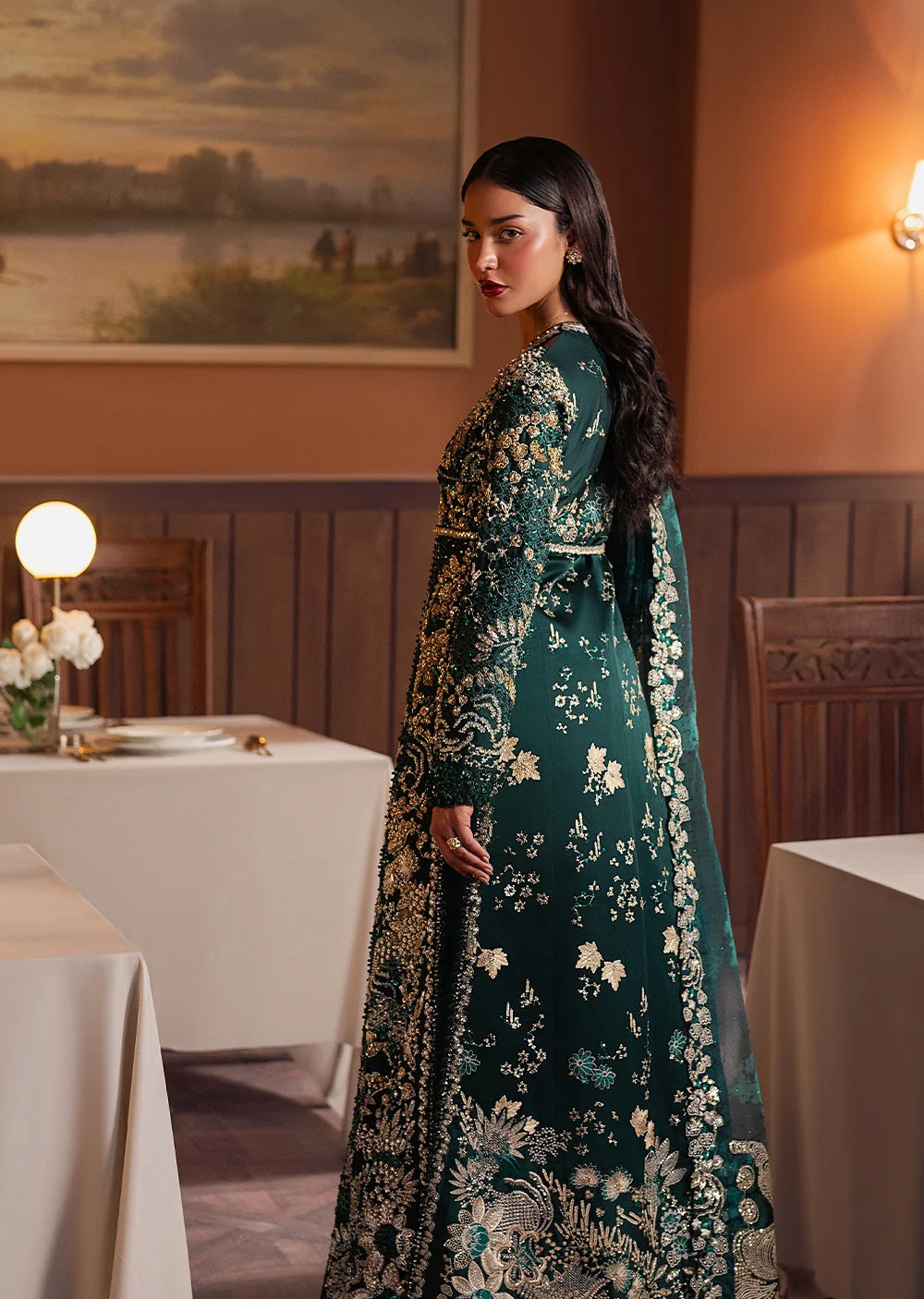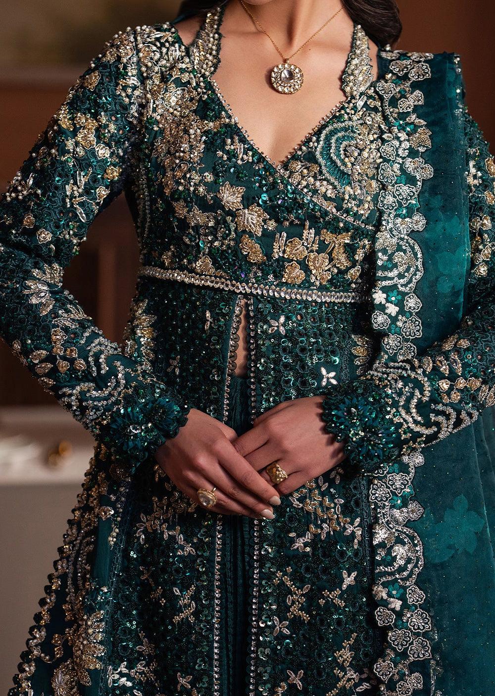 Drenched in deep emerald tones, this elongated shirt is a study in regal detailing and fluid grace. The surface is meticulously hand-embellished with resham, sequins, and metallic thread, forming dense floral and vine motifs that shimmer softly against the rich base. A delicately defined waist lends structure, while the length creates a statuesque fall. Paired with a tonal lehenga beneath and finished with a sheer, intricately worked dupatta, the look feels opulent yet composed — timeless elegance designed for grand evening affairs.