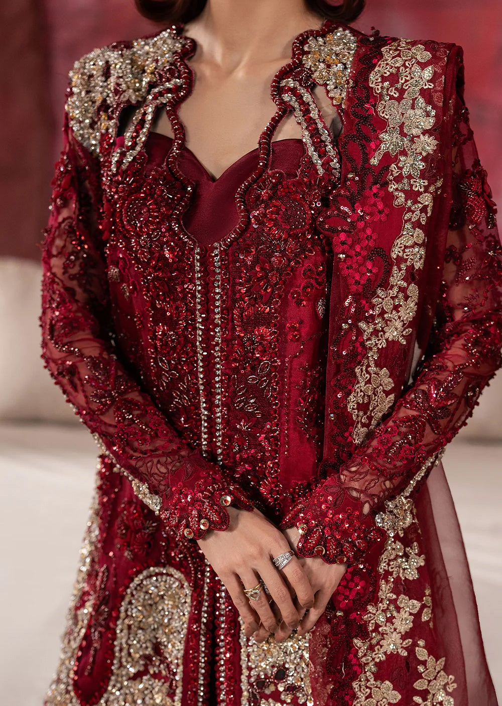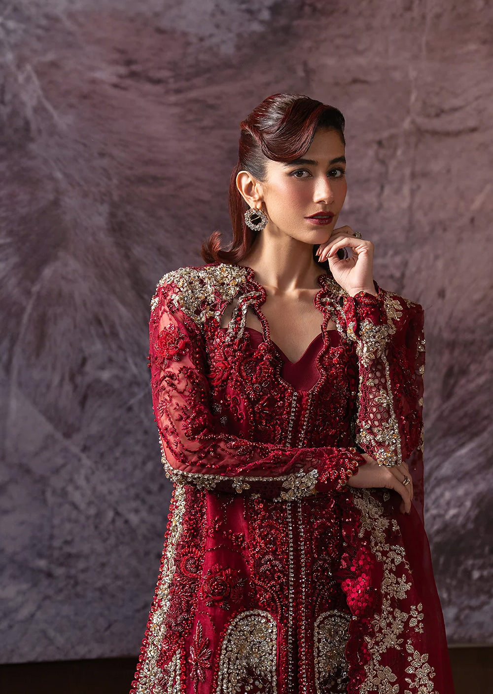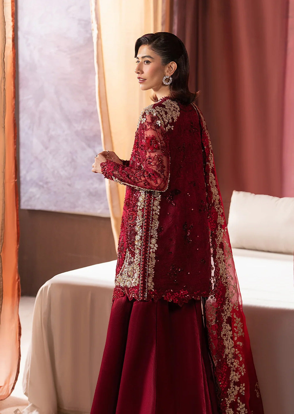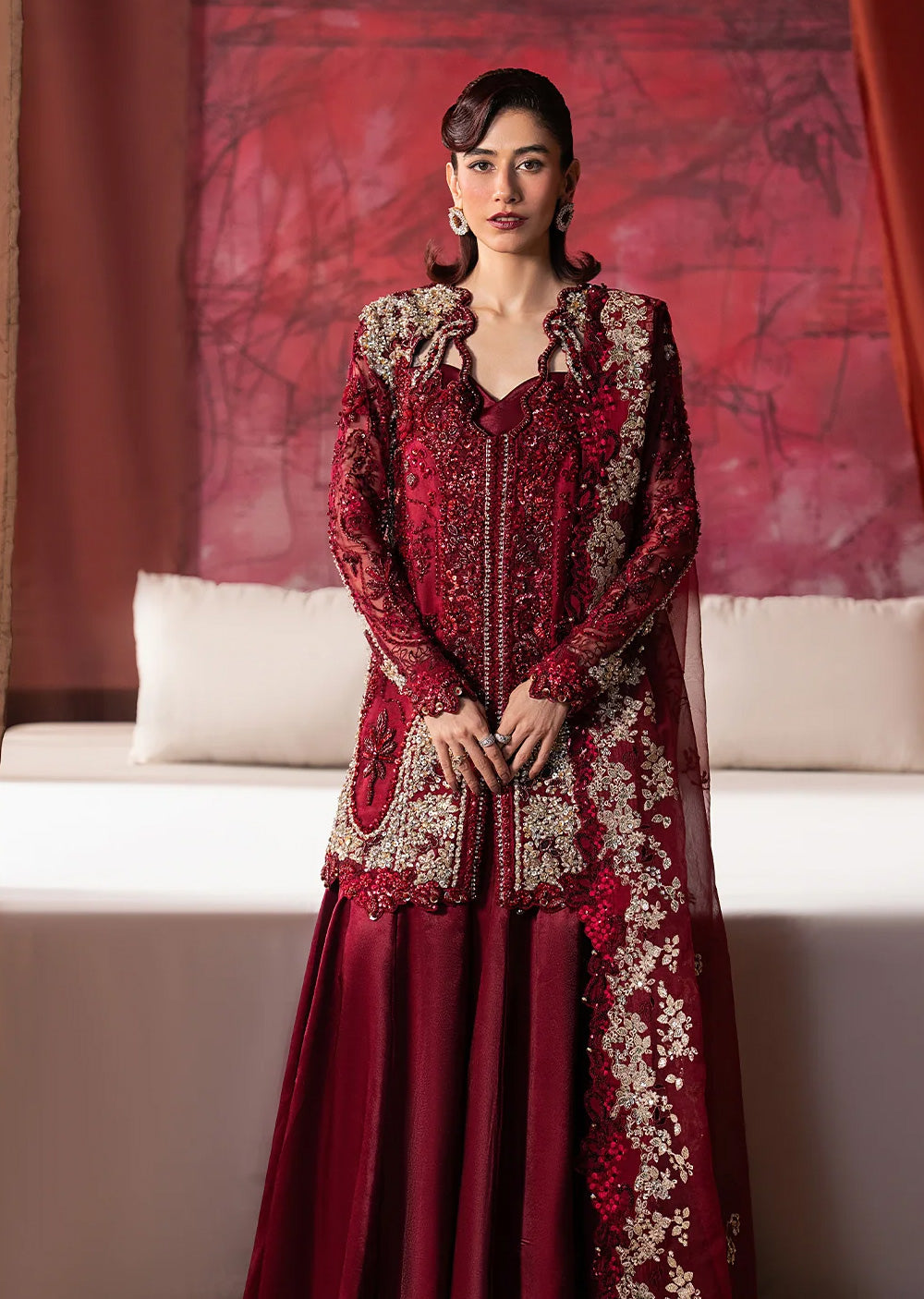 A vision in deep crimson — this ensemble features a richly embellished shirt adorned with intricate gold embroidery, crafted on a fluid, lustrous base. The silhouette flows with effortless grace, balancing regal detail and modern refinement, while the sweeping lower layers add depth and movement. Designed for evenings that call for quiet power, timeless elegance, and undeniable presence.