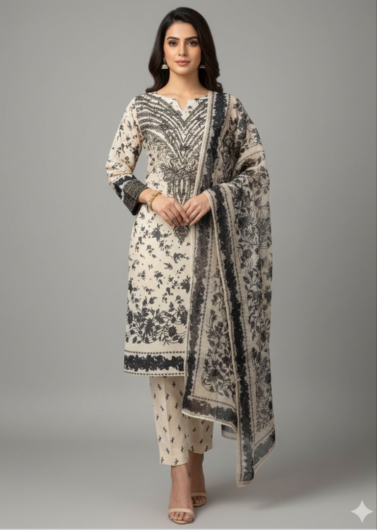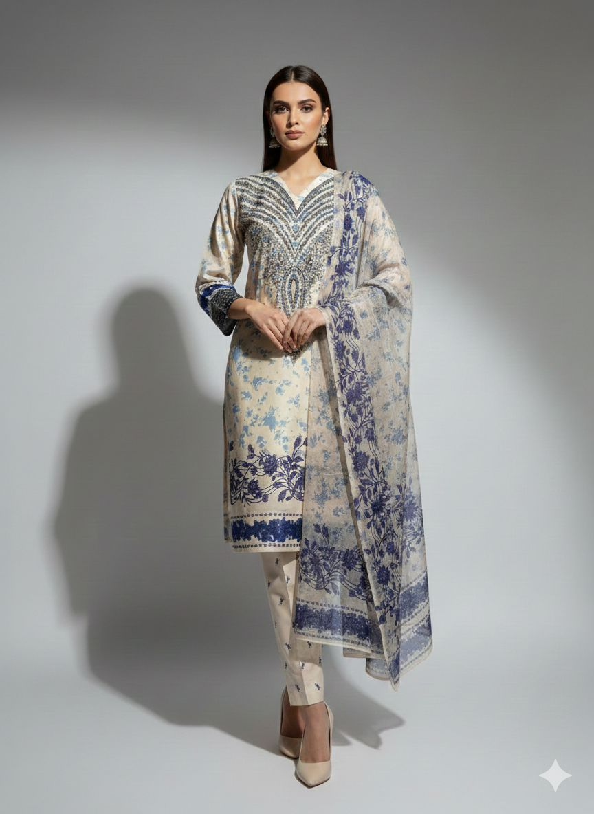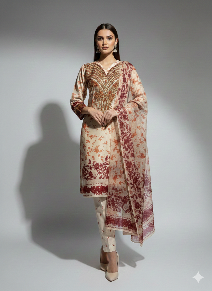 Elevate your wardrobe with this exquisite readymade silk outfit, featuring a beautifully printed design that captures timeless elegance. The ensemble includes a luxurious silk suit paired with a delicate cotton net dupatta, creating a sophisticated layered look. The standout embroidered neckline adds intricate detailing and refined craftsmanship, making this piece perfect for special occasions, celebrations, or when you want to make a lasting impression. Ready to wear and effortlessly chic, this 2025 collection piece combines traditional artistry with contemporary style.