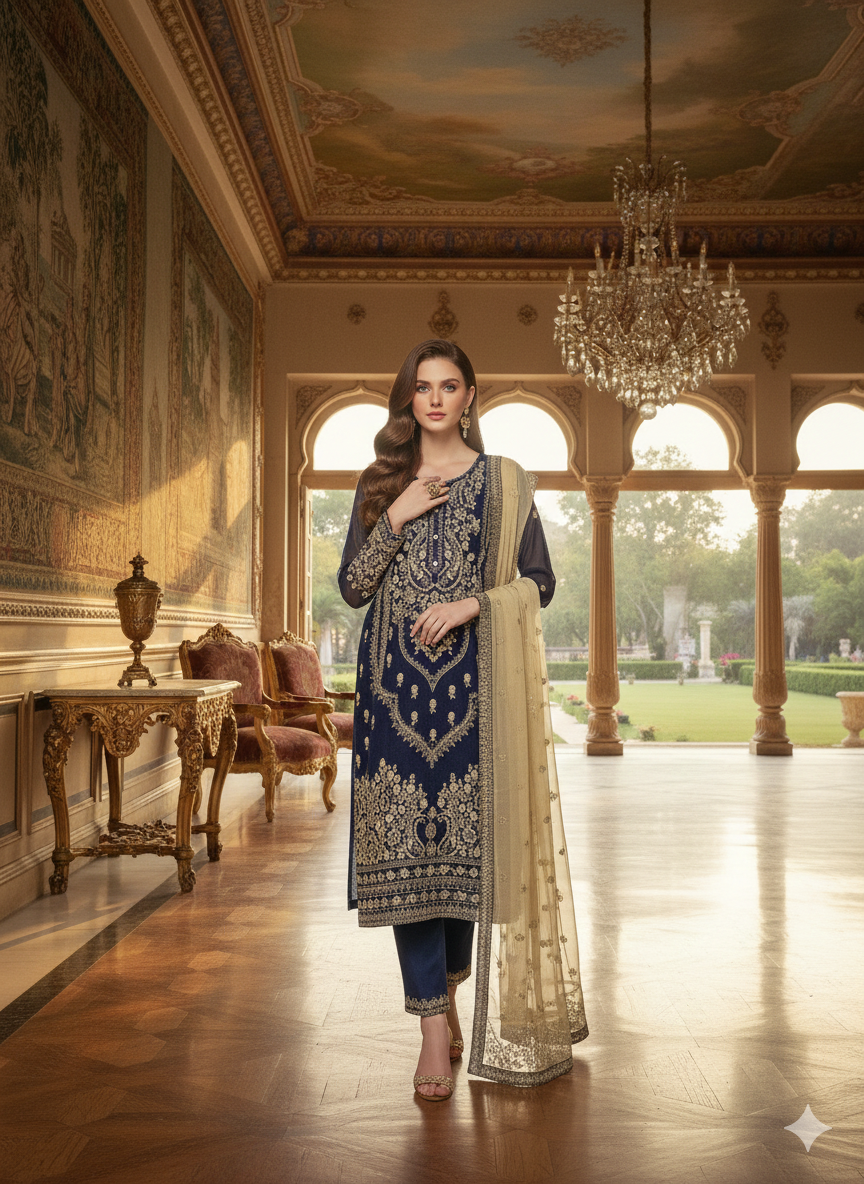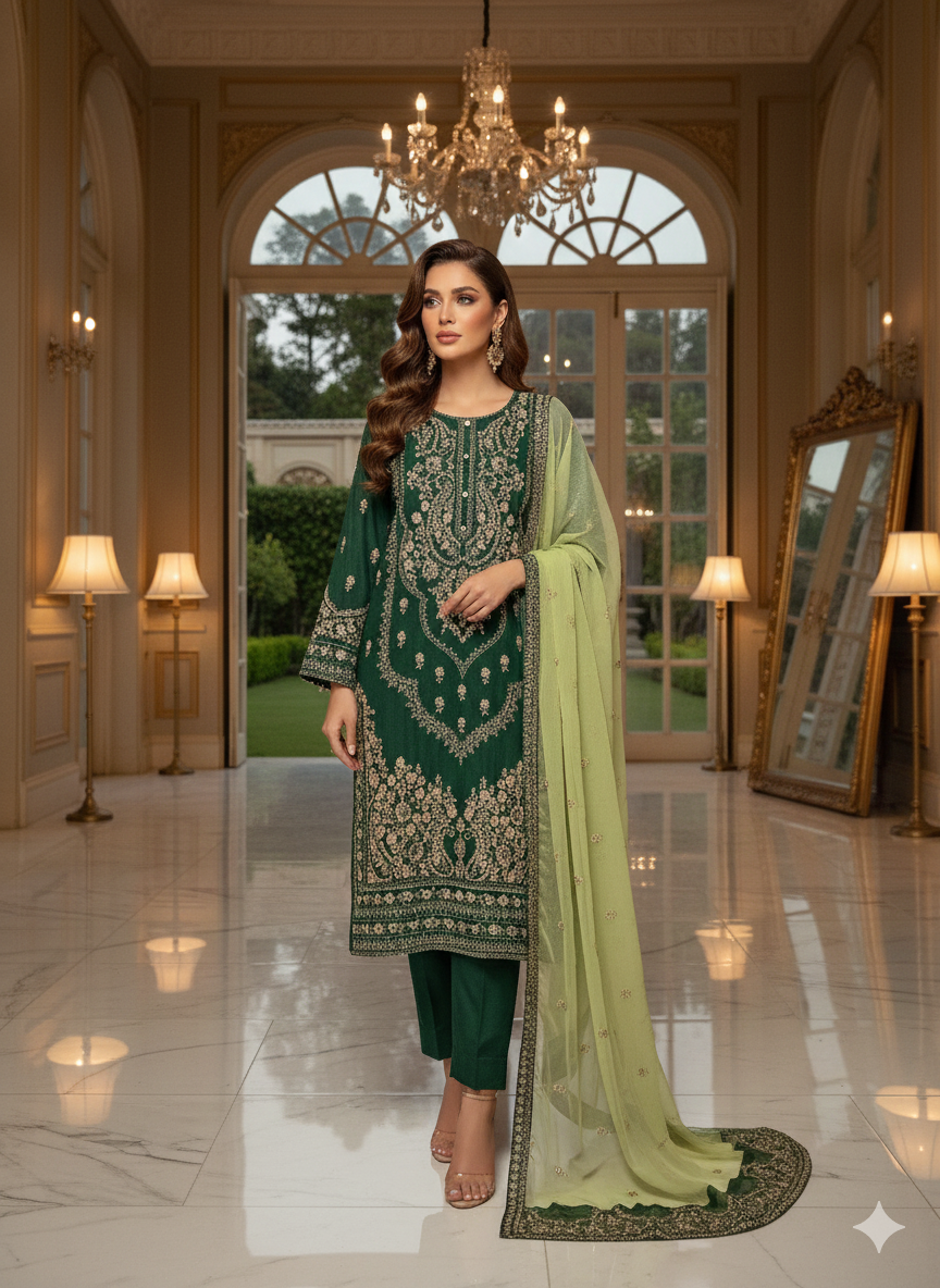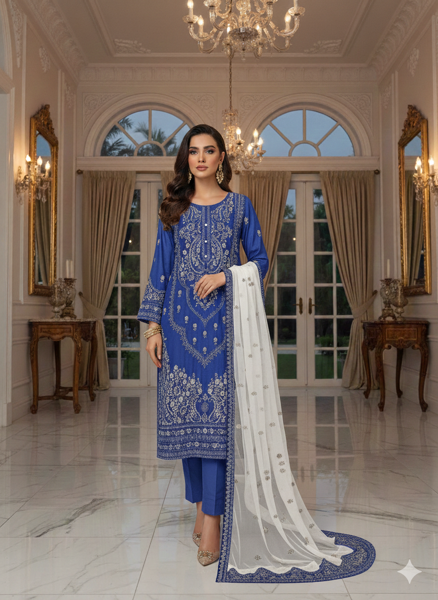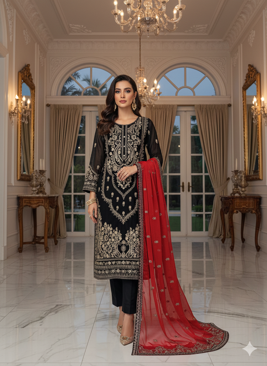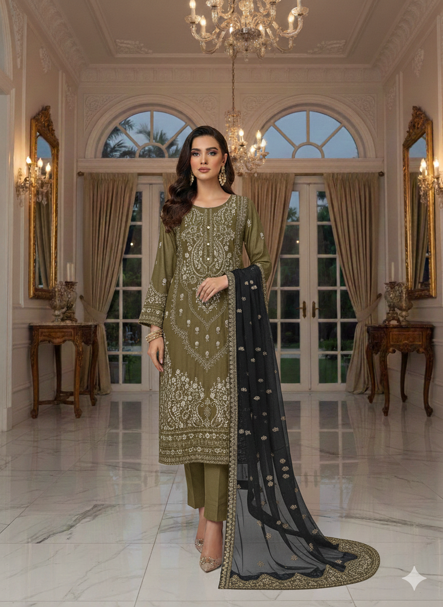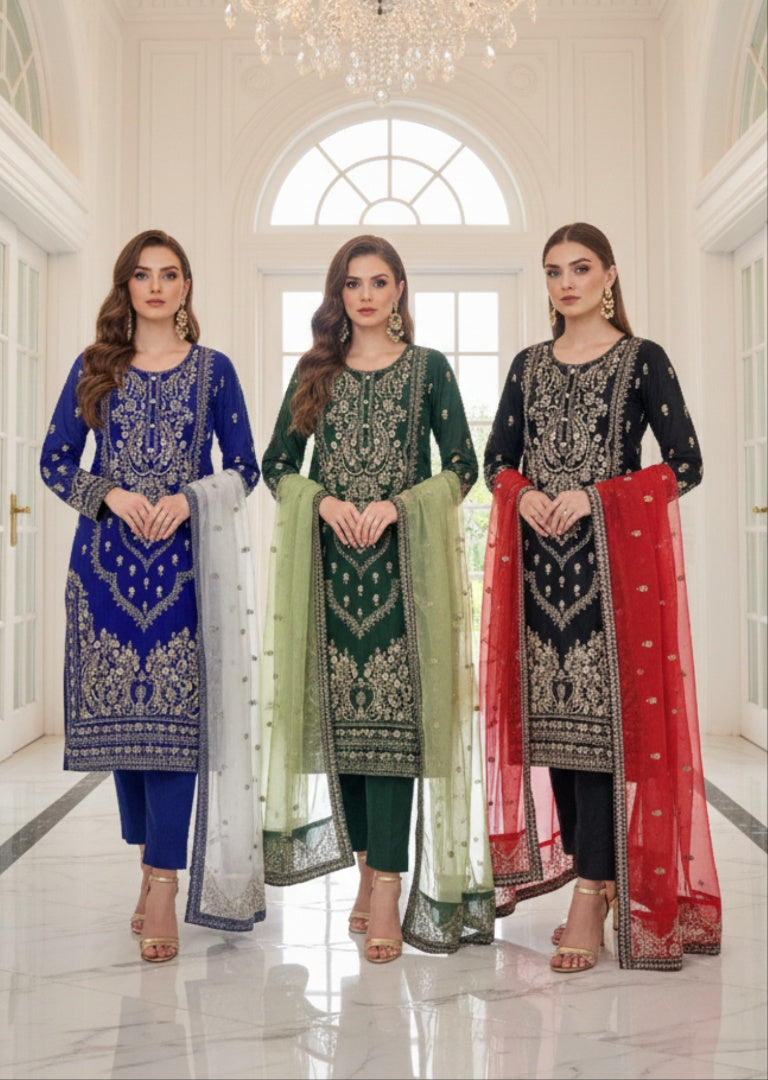 Discover timeless sophistication with this stunning readymade silk outfit from our 2025 collection. Featuring an intricately embroidered neckline that showcases exceptional craftsmanship, this ensemble pairs a luxurious silk suit with an ethereal cotton net dupatta for a beautifully layered aesthetic. The exquisite printed design effortlessly blends traditional elegance with contemporary style, making it your go-to choice for weddings, celebrations, and special occasions. Slip into refined glamour without the fuss—this ready-to-wear piece delivers instant sophistication and lasting impressions.