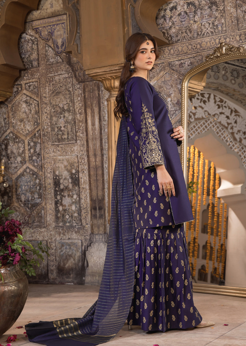 The gharara has beautiful foil printing, adding a touch of glamour and matching perfectly with the shirt.