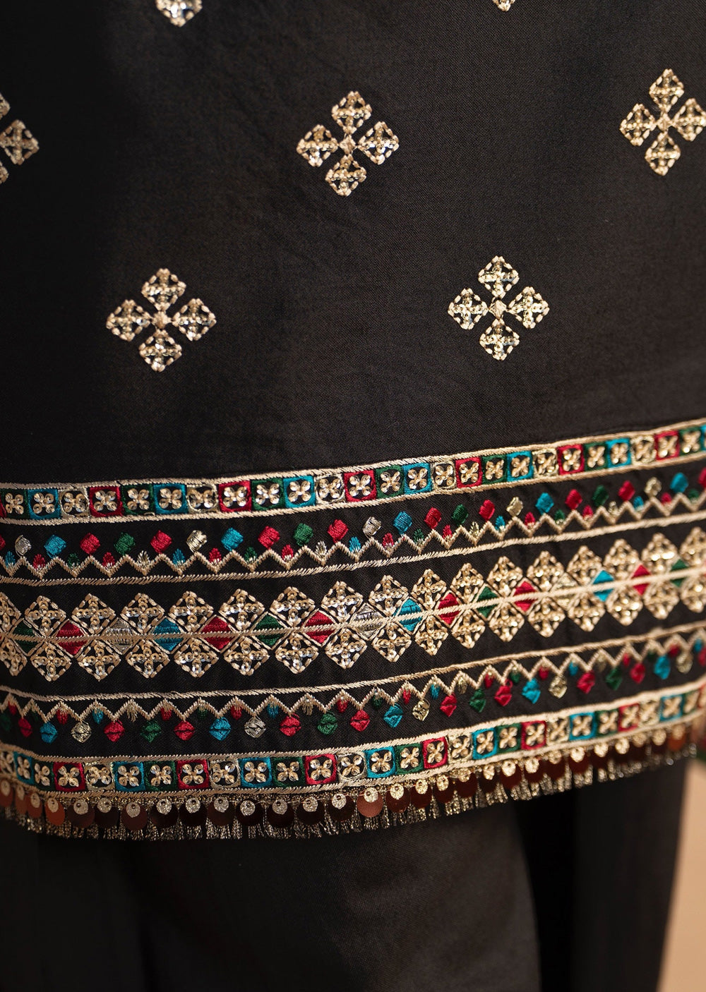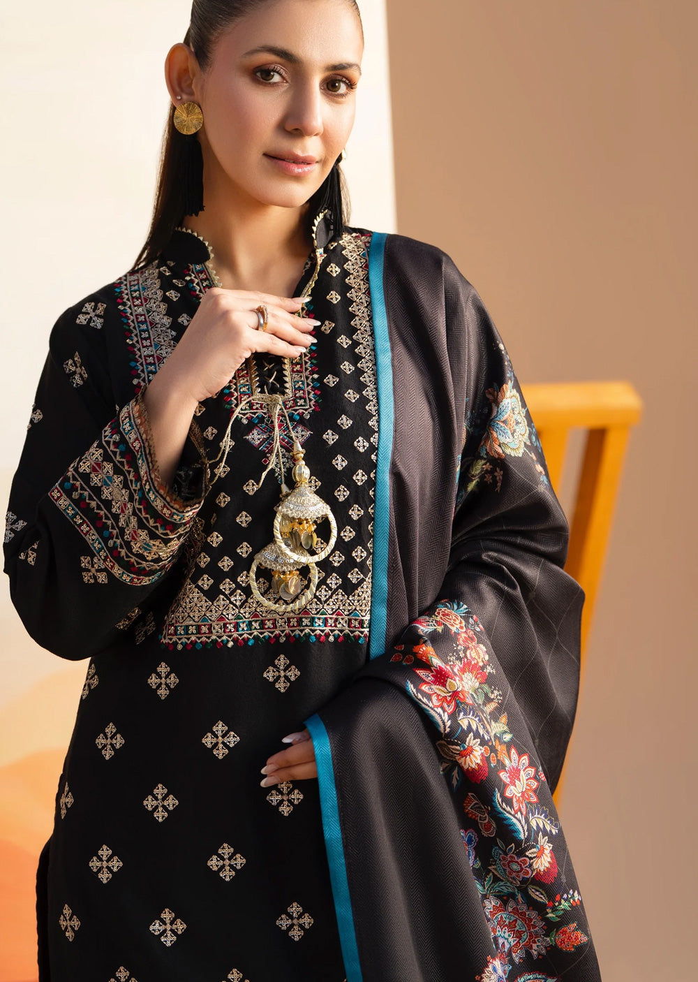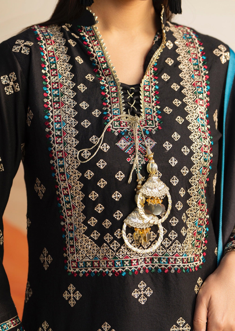 This elegant dhanak suit features a geometric-embroidered kameez with traditional tassels and matching shalwar. The look is elevated by a luxurious pashmina grip dupatta, finished with a vibrant turquoise trim and a rich floral