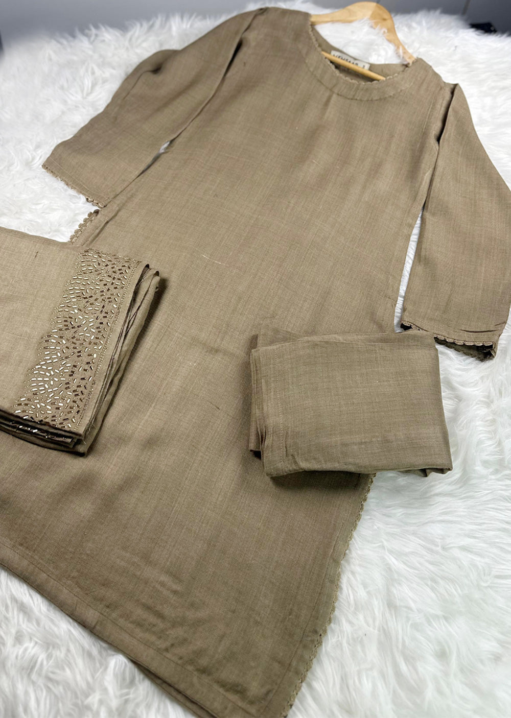 Stay warm and stylish this winter with  wool winter suit! Made with high-quality wool and featuring a beautiful embroidered shawl, this readymade suit is stitched in a modern style to keep you looking your best. Don't sacrifice comfort for fashion - get the best of both with our pink wool winter suit!