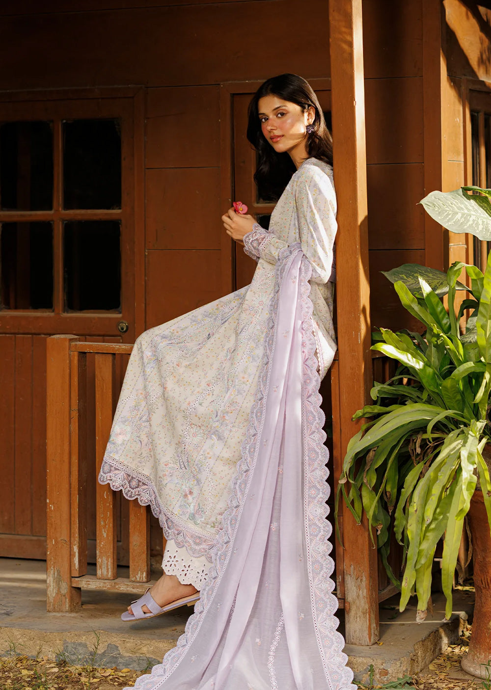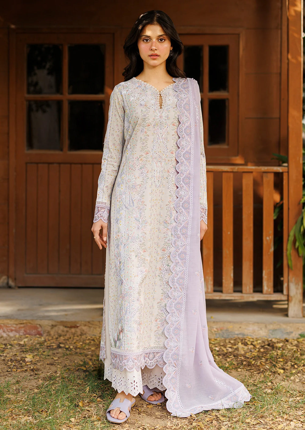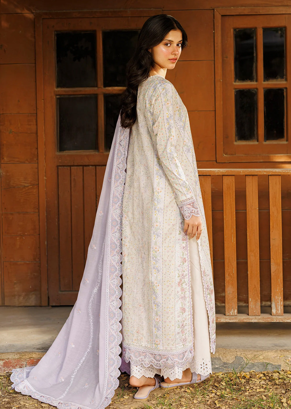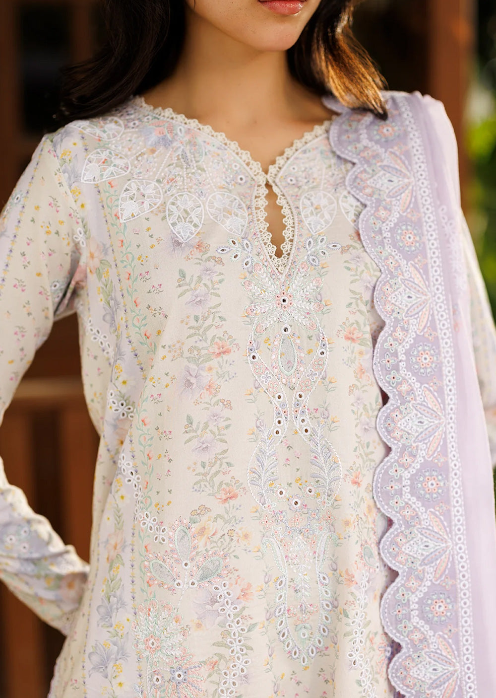 An ivory ensemble enriched with delicate pastel florals, creating a calm and romantic palette that feels light and airy. The long shirt is adorned with fine embroidery and subtle cutwork, allowing gentle hues of blush, lavender, and soft green to emerge with quiet elegance. The fluid silhouette offers ease and graceful movement while maintaining a refined structure. Paired with white trousers finished with intricate detailing, the look remains balanced and composed. A sheer lavender dupatta, edged with scalloped embroidery, drapes effortlessly to complete the ensemble. The overall effect is serene and timeless — an expression of colour harmony, craftsmanship, and understated elegance.
