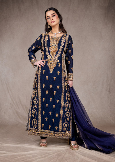 The Shirt (Kameez/Jacket): A long, full-sleeved shirt featuring a high-quality fabric richly adorned with heavy, meticulous Dabka, Zari, and Sequin embroidery. The intricate gold work forms beautiful floral and geometric patterns across the bodice and sleeves.