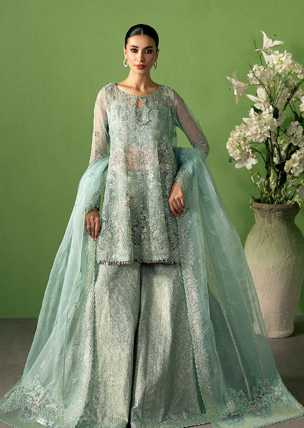This lilac ensemble in net and organza is richly adorned with silver embroidery and sequins that shimmer with elegance. The long shirt features a delicate V-neckline and sheer embroidered sleeves, paired with a flowy tonal silk sharara and an embroidered scalloped dupatta. Exuding regal femininity, this look is perfect for weddings, receptions, or grand evening celebrations.