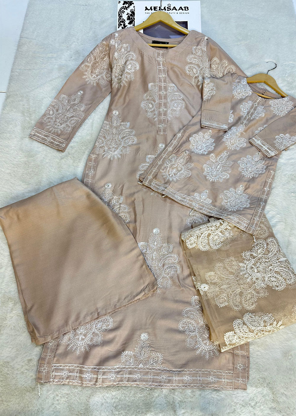 Elevate your style with this beautiful HK255 Readymade Linen Suit! The stunning embroidery motifs add a touch of elegance and the embroidered organza duppatta completes the look. Perfect for any occasion, this suit is sure to turn heads and leave a lasting impression. Embrace the beauty and craftsmanship of this must-have piece.