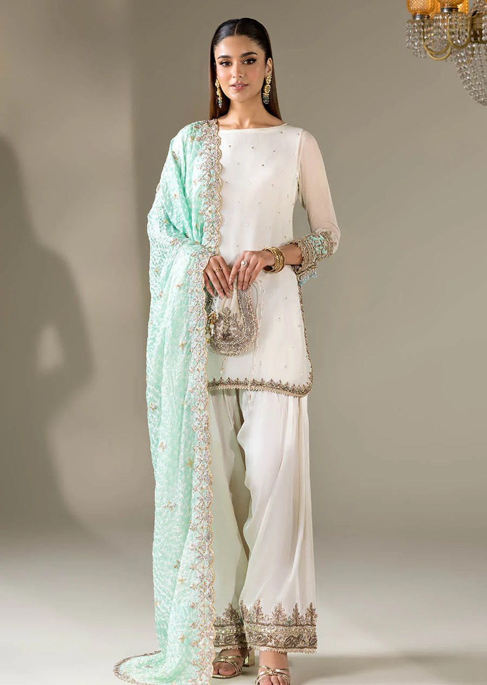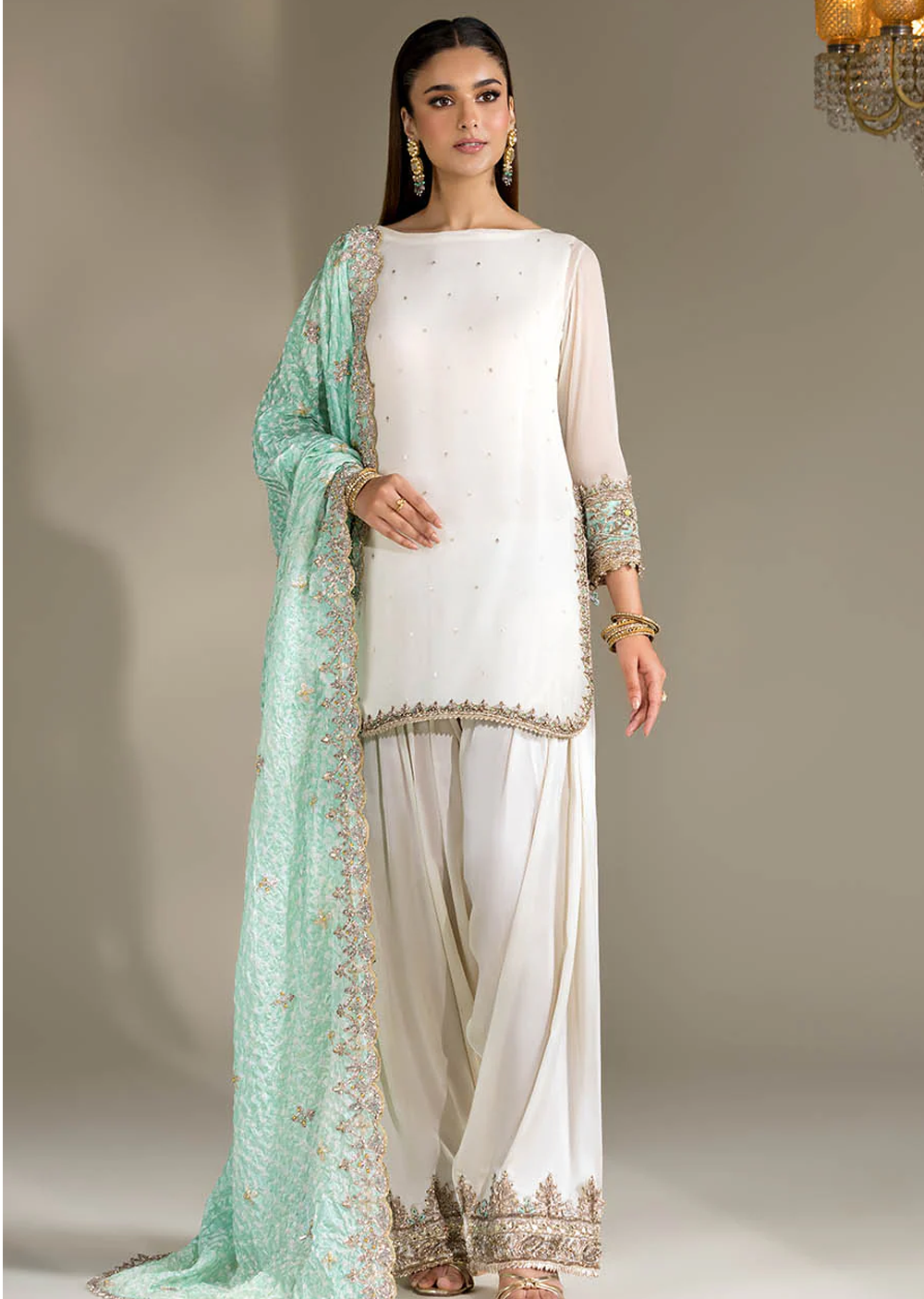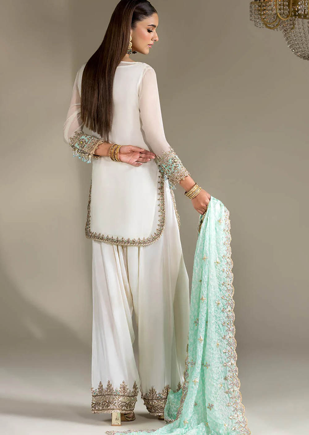• Shirt: Crinkle Chiffon hand-embroidered (Kora, dabka & Gotta work)