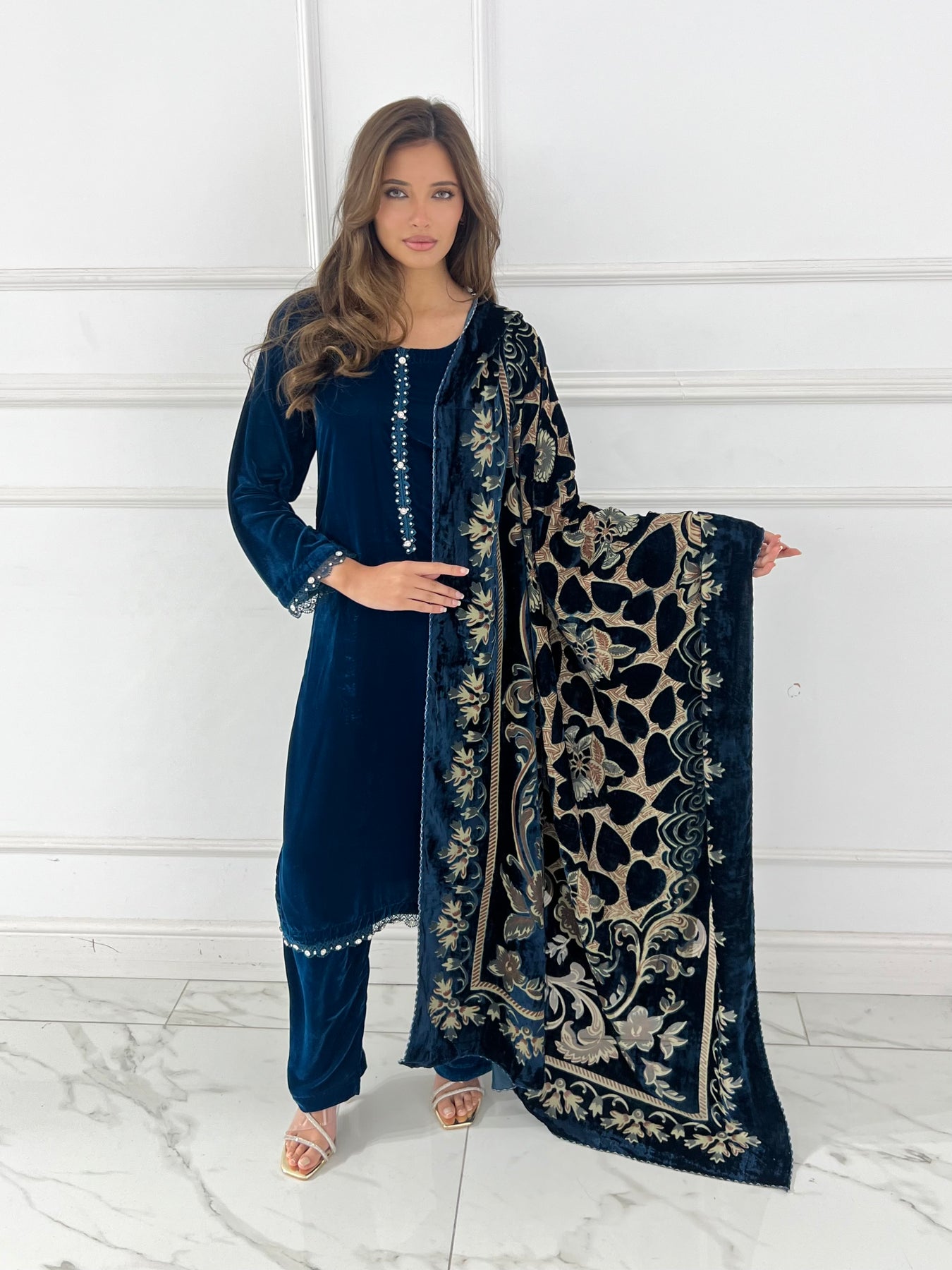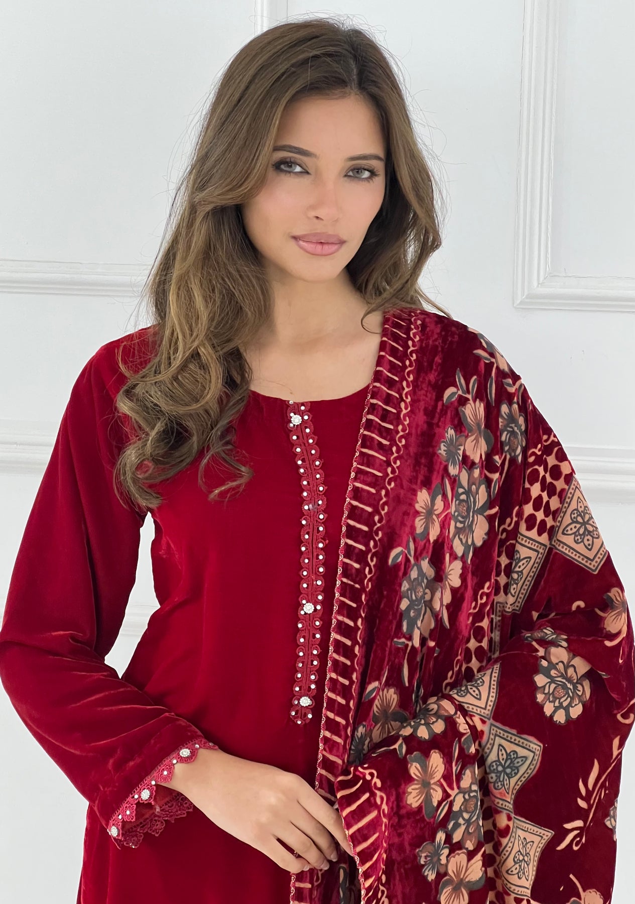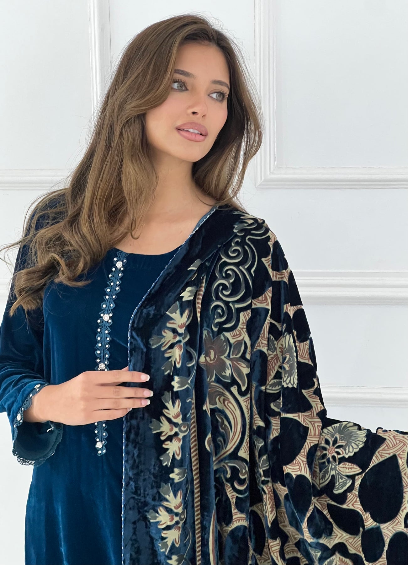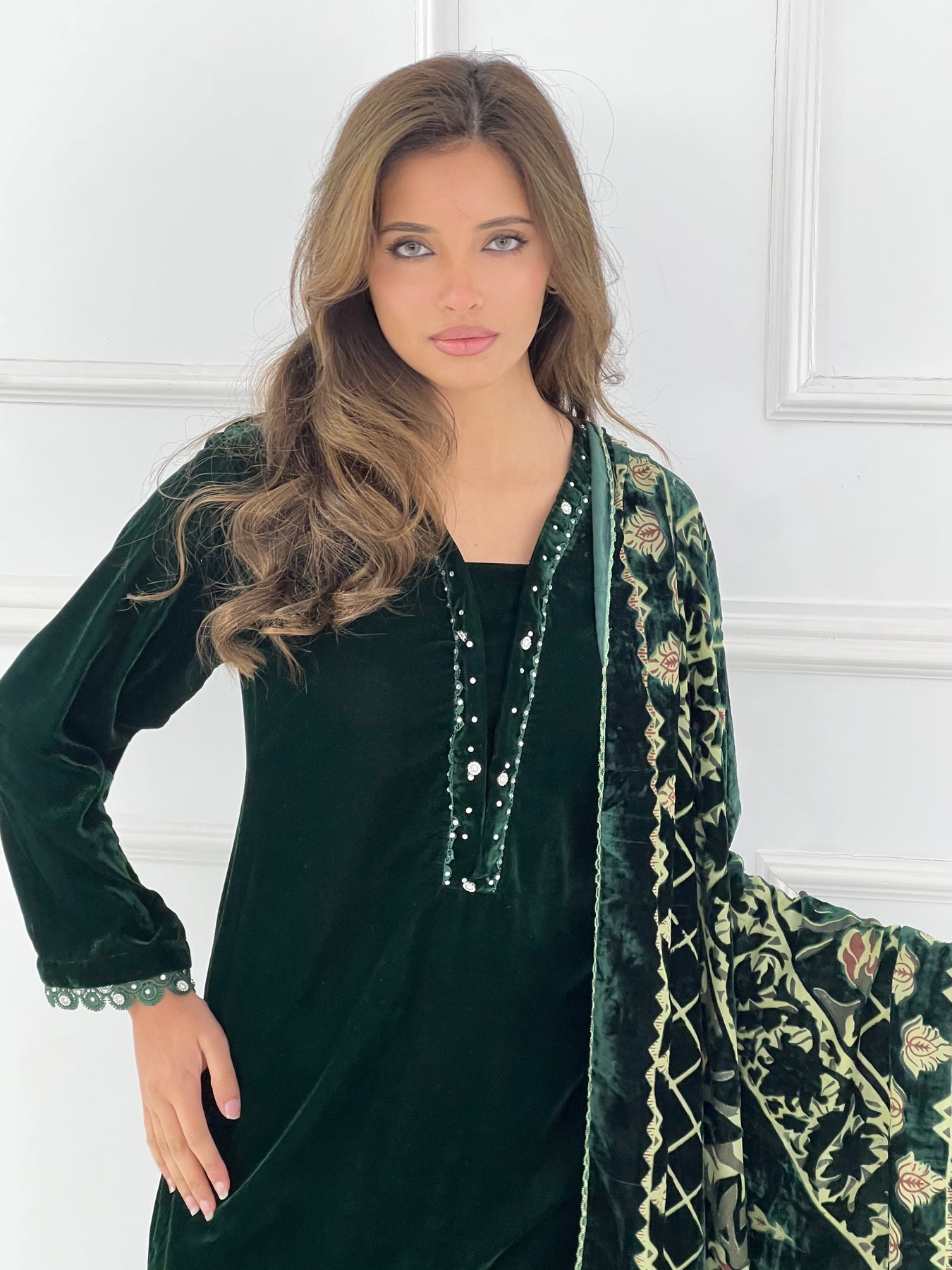 Elevate your wardrobe with this luxurious velvet suit, expertly paired with an elegant palachi scarf. The sumptuous velvet fabric drapes beautifully, creating a refined silhouette perfect for special occasions and celebrations. The coordinating palachi scarf adds a sophisticated finishing touch, allowing you to express your personal style with confidence. Crafted for those who appreciate quality and timeless elegance, this ensemble combines traditional craftsmanship with contemporary design. Make a striking impression at weddings, festivals, or formal gatherings with this stunning two-piece set that promises comfort without compromising on glamour.