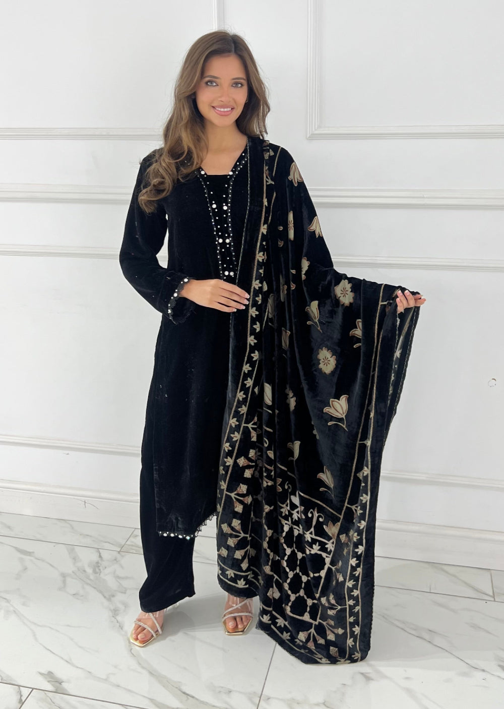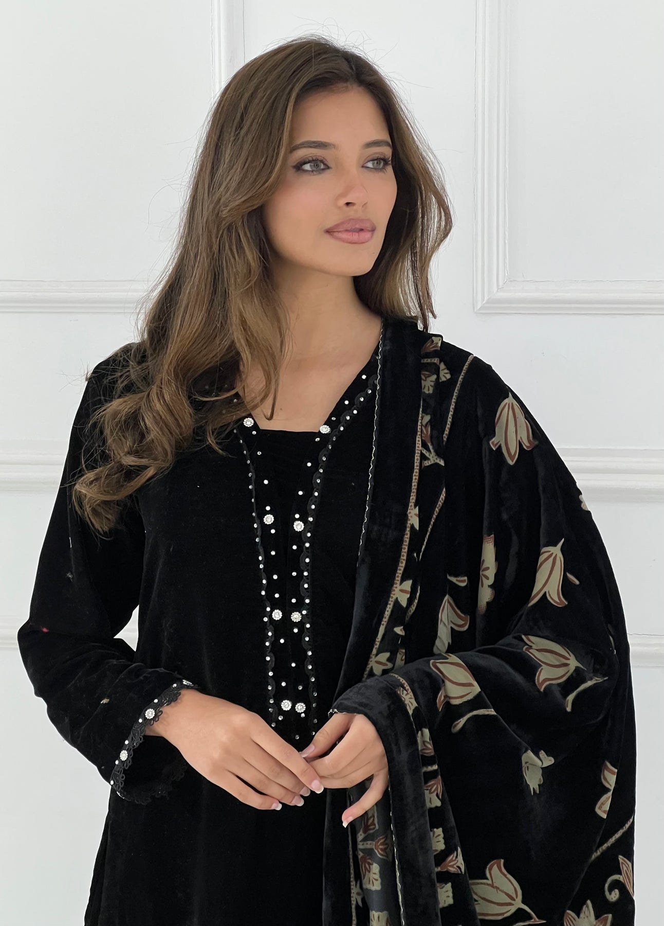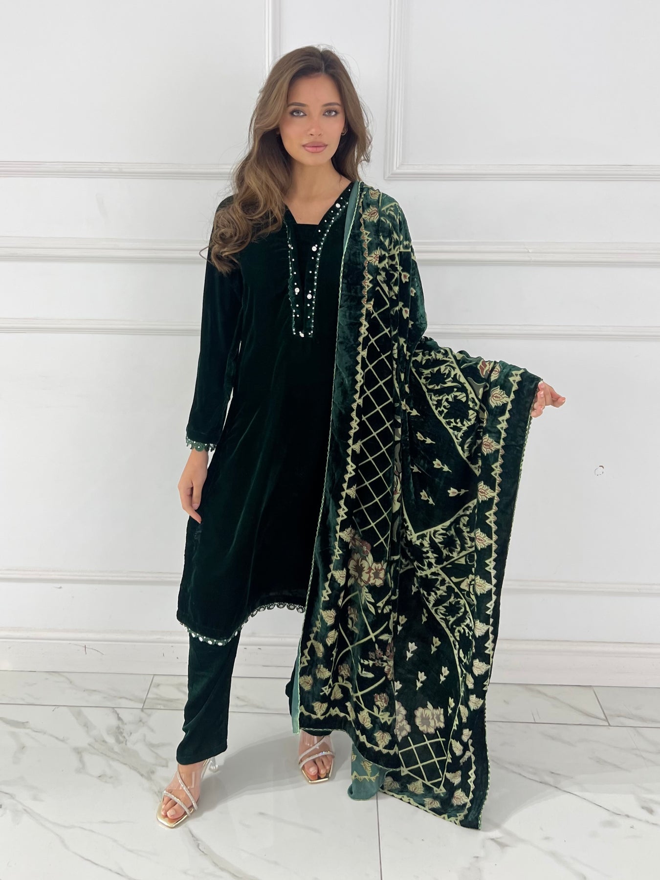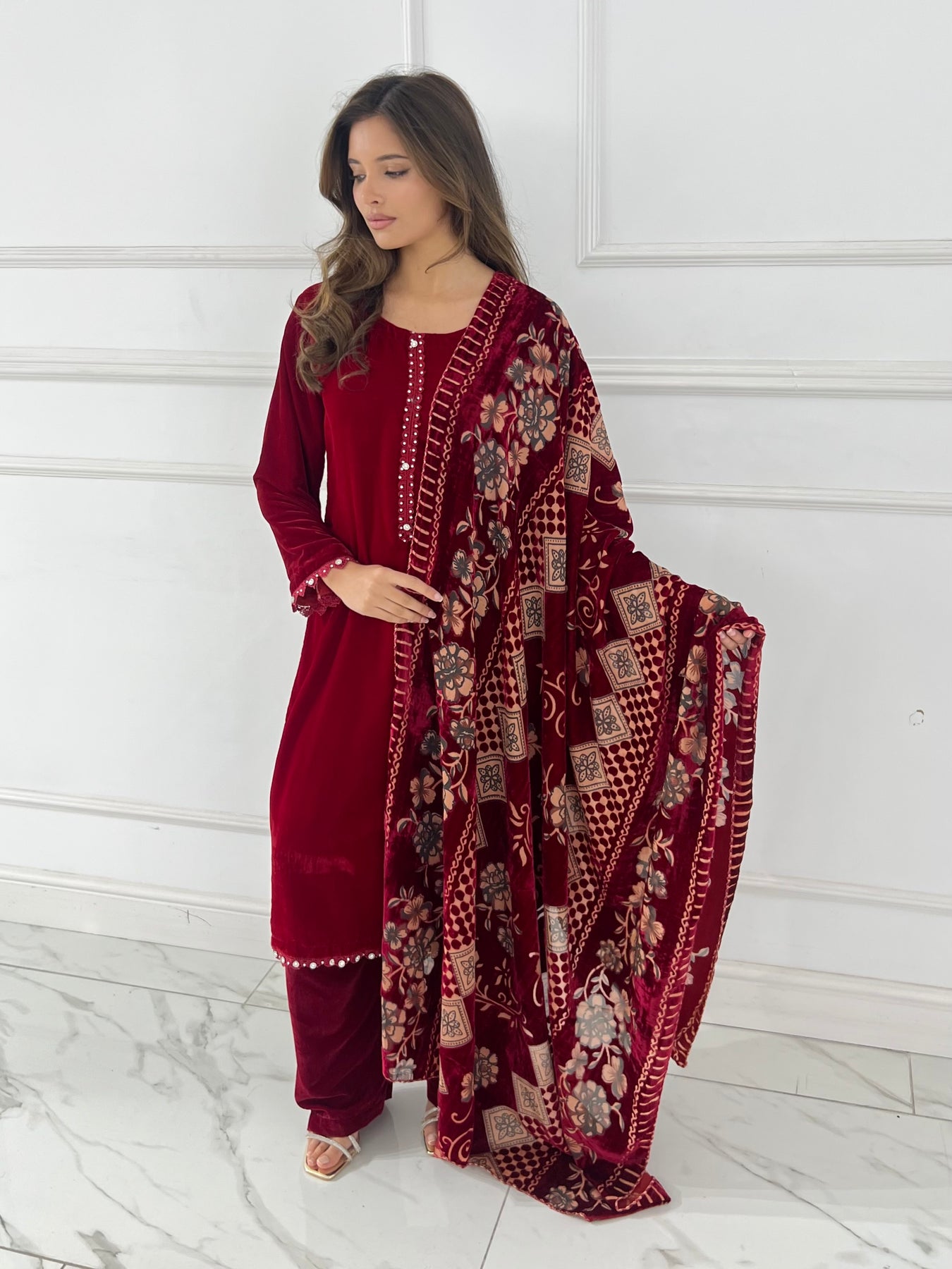 Elevate your wardrobe with this luxurious velvet suit, expertly paired with an elegant palachi scarf. The sumptuous velvet fabric drapes beautifully, creating a refined silhouette perfect for special occasions and celebrations. The coordinating palachi scarf adds a sophisticated finishing touch, allowing you to express your personal style with confidence. Crafted for those who appreciate quality and timeless elegance, this ensemble combines traditional craftsmanship with contemporary design. Make a striking impression at weddings, festivals, or formal gatherings with this stunning two-piece set that promises comfort without compromising on glamour.