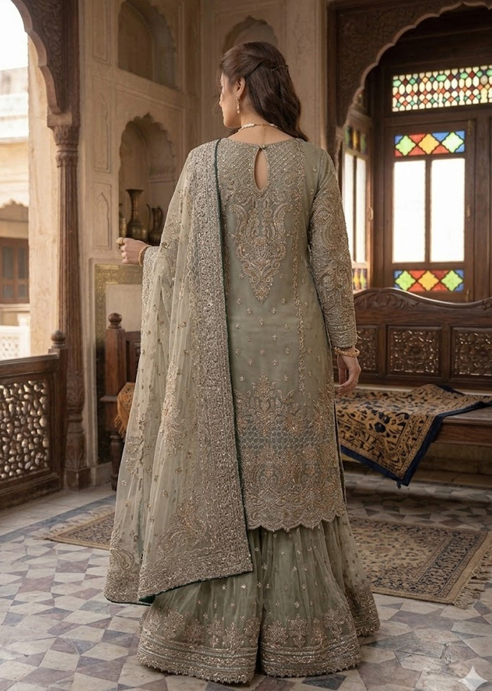 • Shirt (Kameez): Hand-Embellished Organza with Heavy Embroidery & Scalloped Hemlines