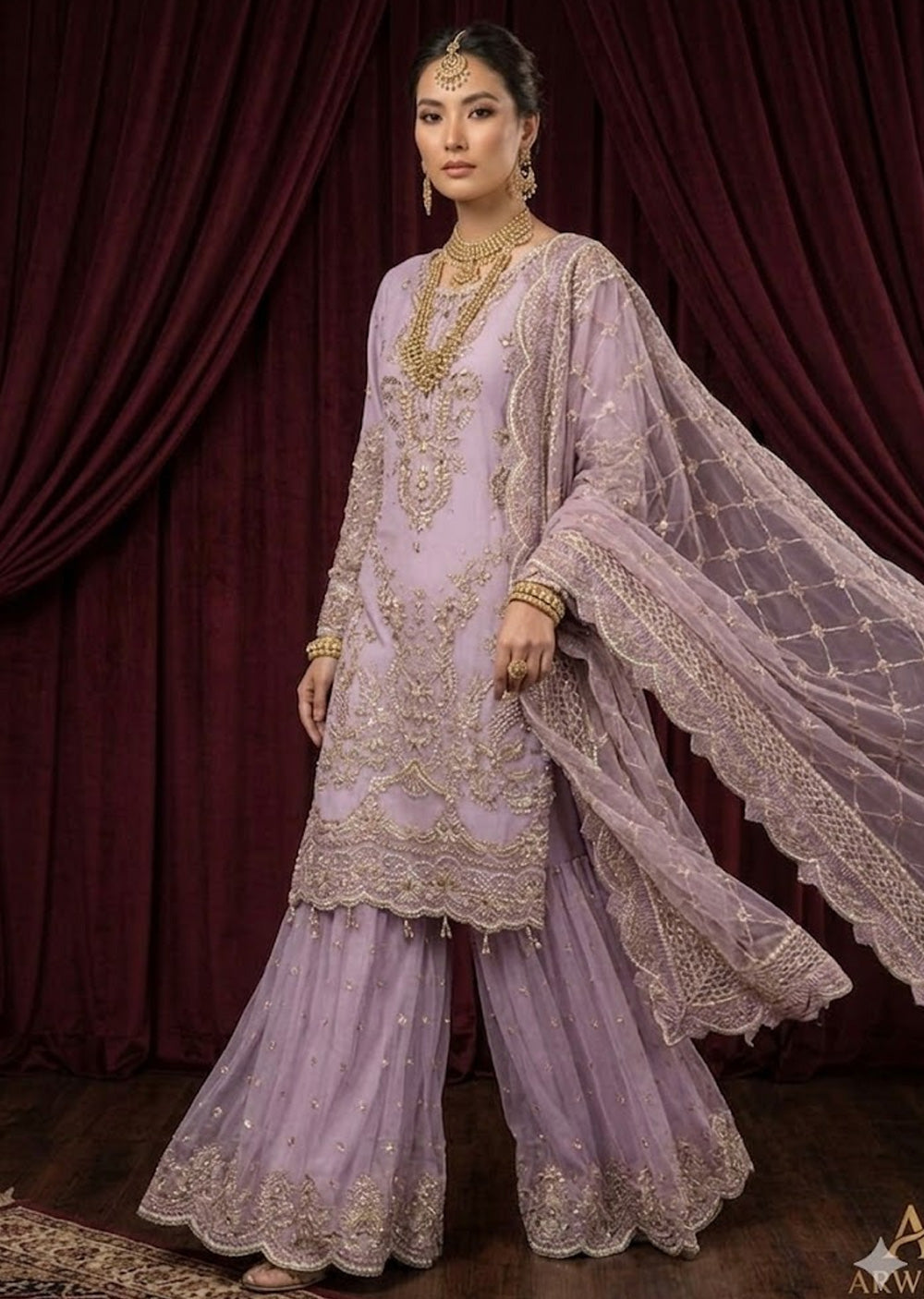 Embrace festive elegance with this stunning three-piece light purple chiffon ensemble. The short-length shirt is adorned with intricate antique gold embroidery and sparkling stone embellishments, creating a regal statement. It pairs beautifully with a voluminous chiffon sharara featuring subtle vertical shimmer lines and a wide embroidered border. A matching net dupatta with a velvet-trimmed border and cross-hatch embroidery completes the look, offering a layered and sophisticated finish—perfect for weddings, cultural celebrations, and special occasions.