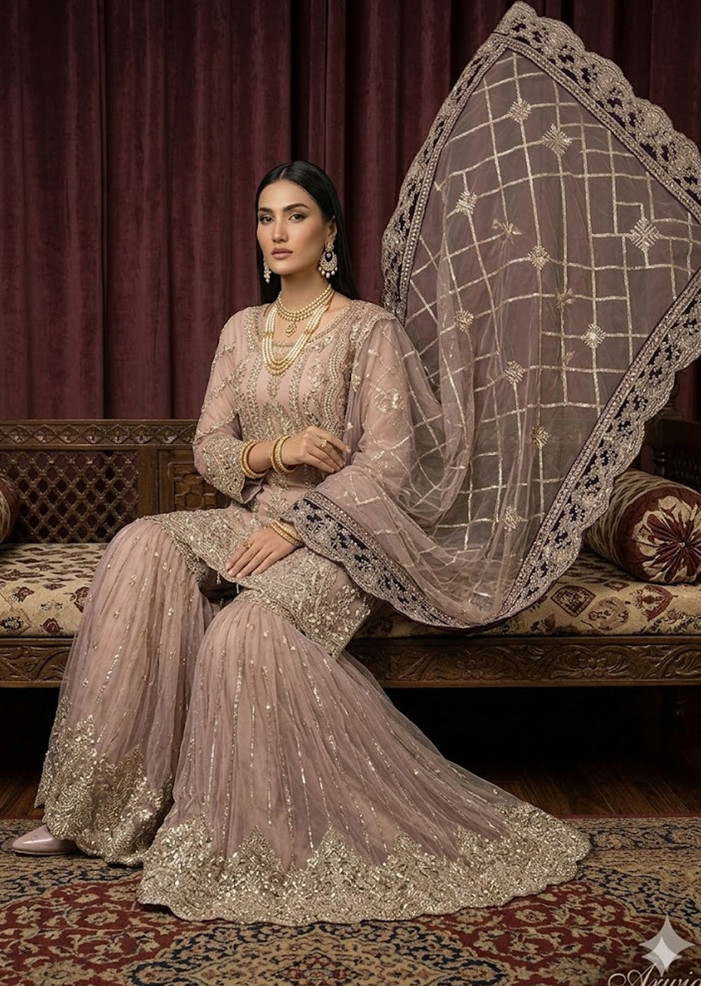 The Top (Kameez): A pink kameez made of soft net fabric, adorned with heavy gold embroidery and shimmering sequins. It features a decorative border and a delicate back design.