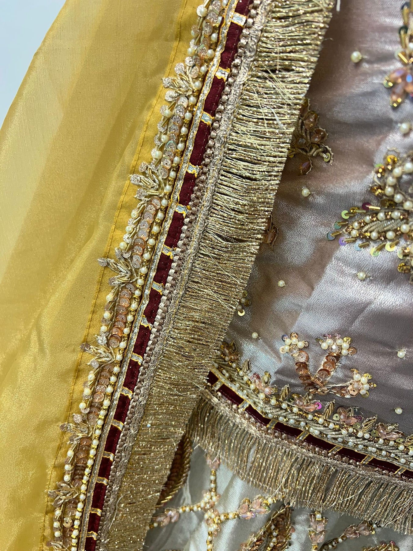 Discover timeless elegance with this exquisite lengha choli, meticulously crafted from pure zari tissue fabric. Every inch showcases intricate handwork embroidery, creating a stunning visual narrative of traditional artistry. The ensemble is beautifully complemented by a luxurious organza scarf adorned with four-sided handwork borders, adding layers of sophistication to your look. Perfect for weddings, celebrations, and special occasions, this designer piece combines heritage craftsmanship with contemporary grace. Elevate your ethnic wardrobe with a garment that speaks volumes about your refined taste and appreciation for authentic, handcrafted beauty.
