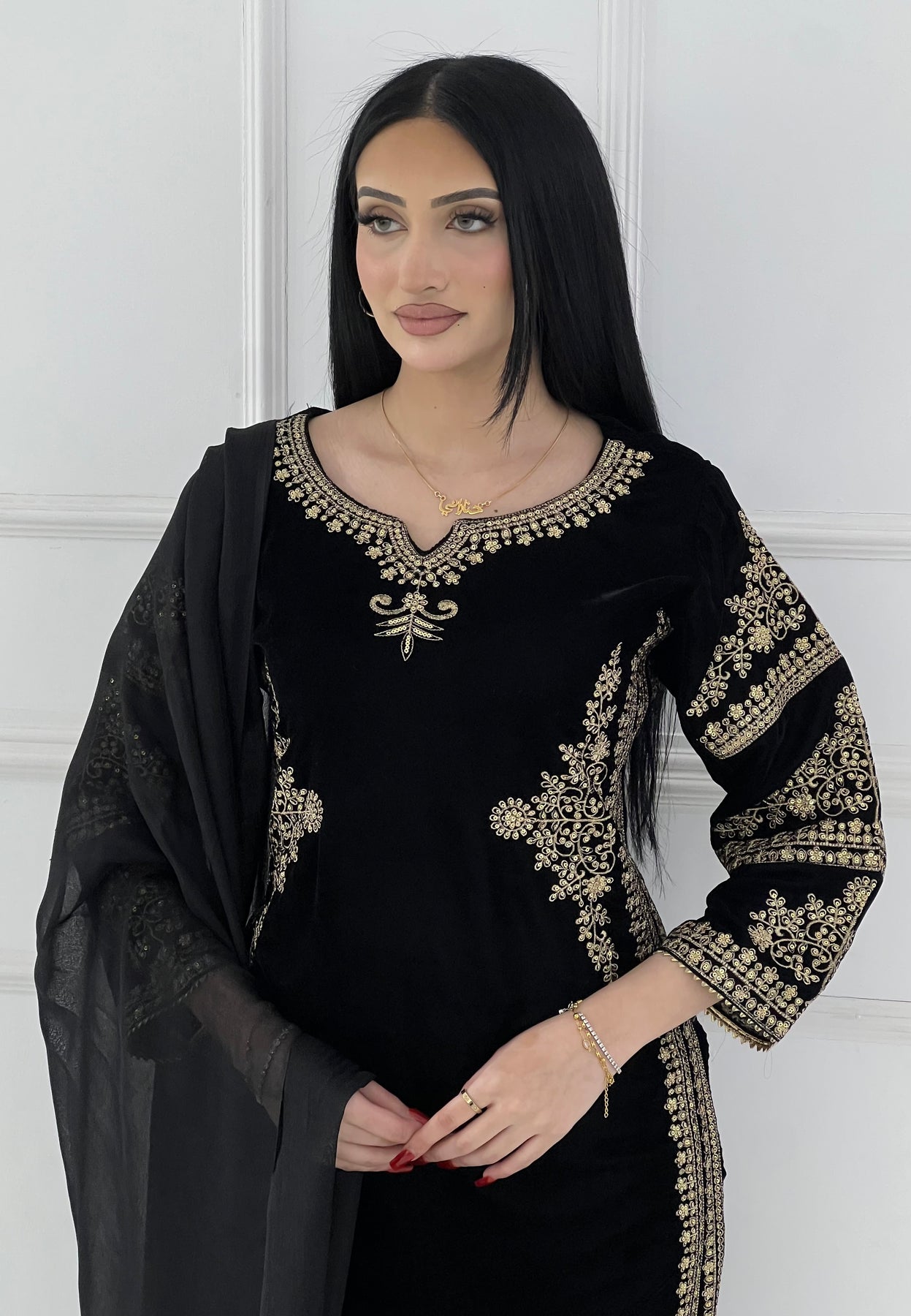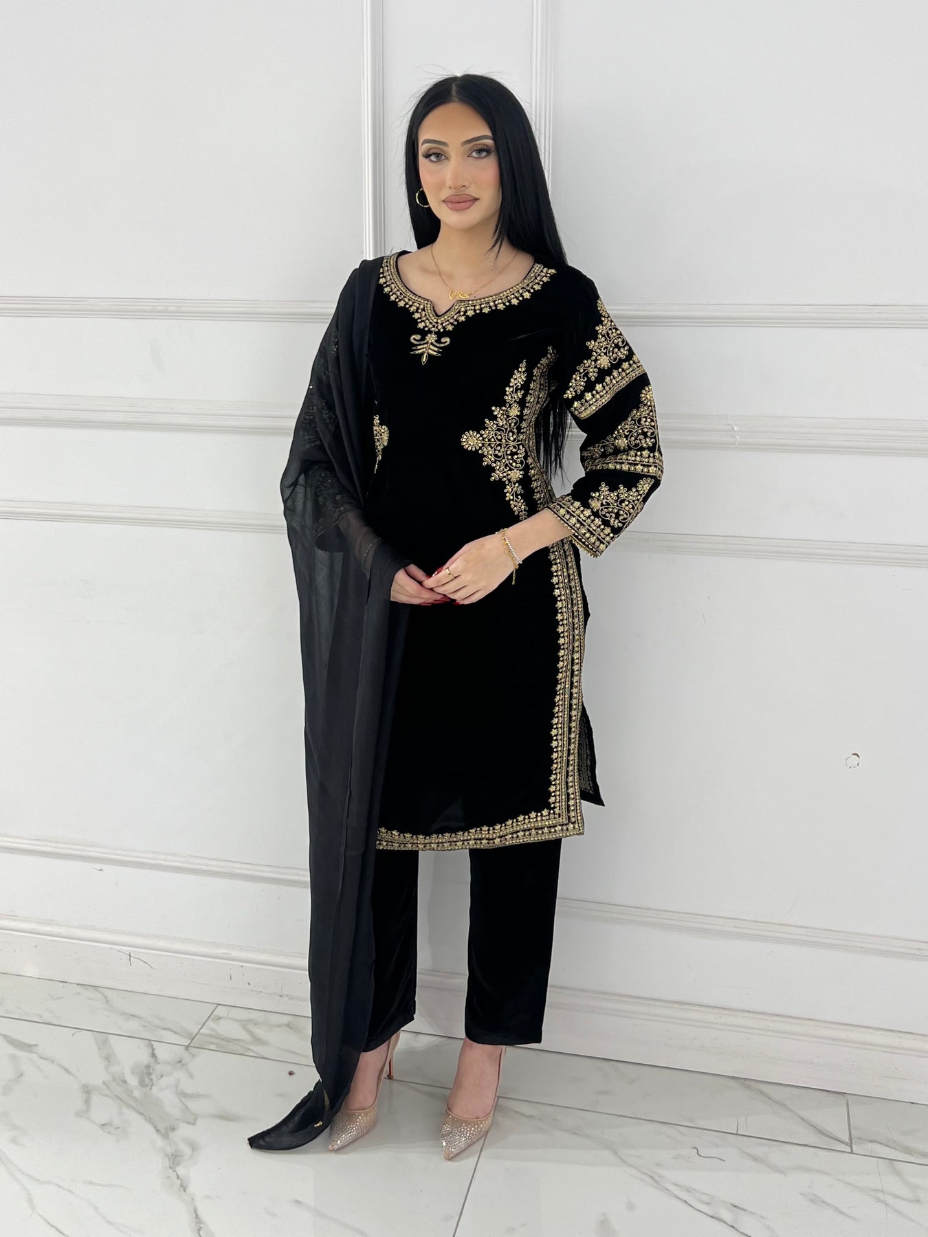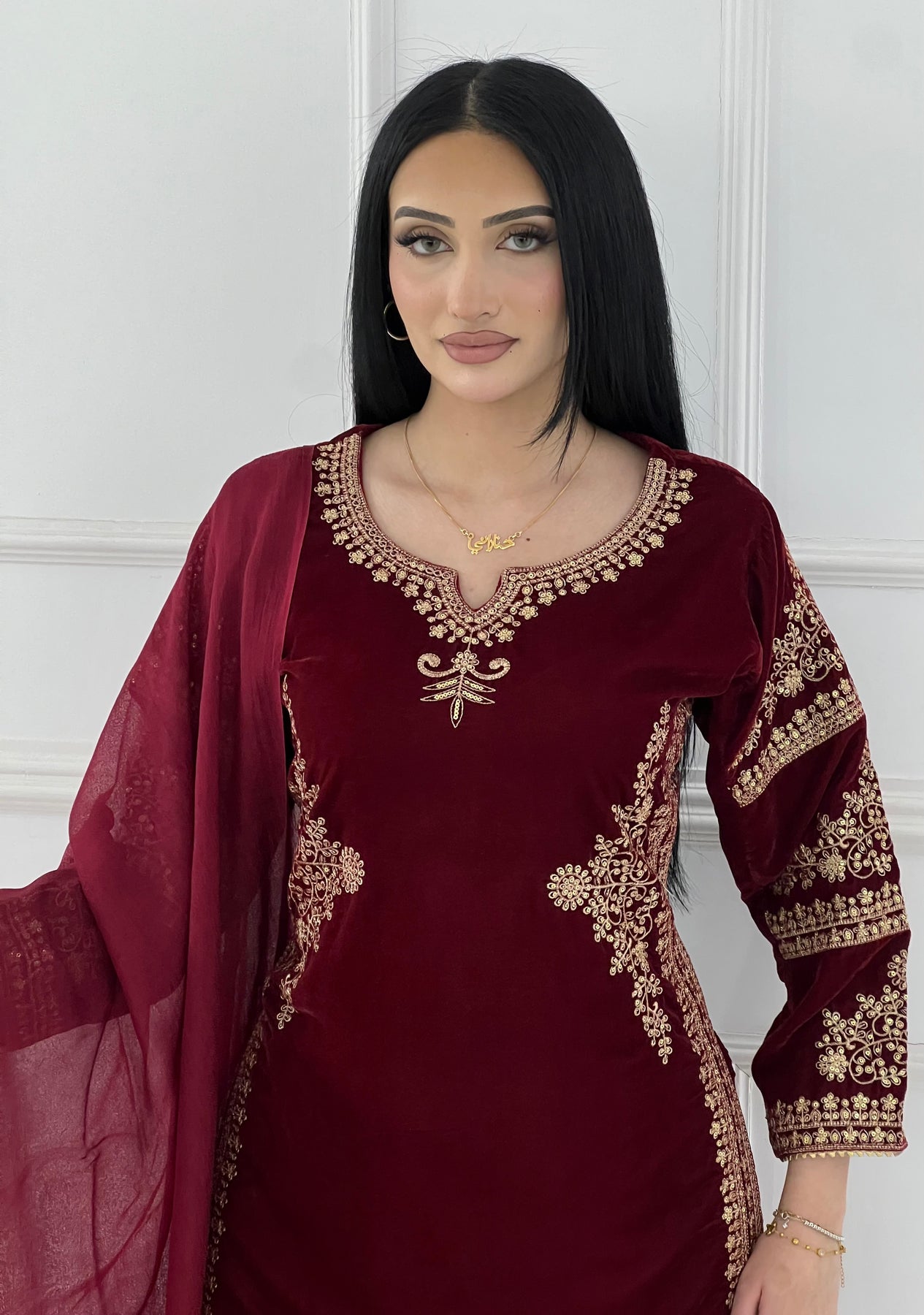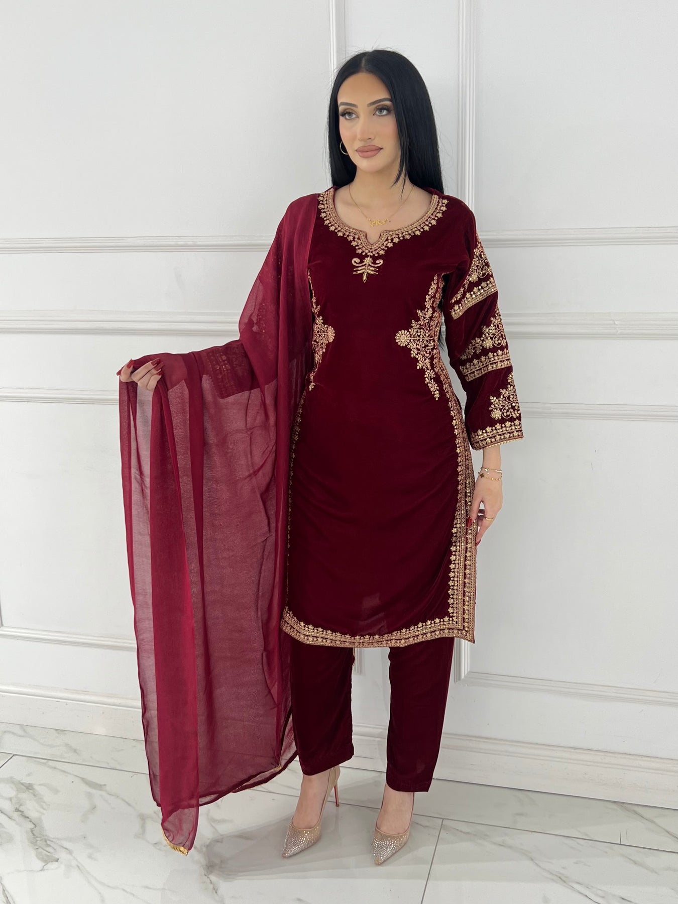 This exquisite three-piece velvet suit features intricate embroidery paired with a delicate chiffon duppatta, creating a look of refined elegance.