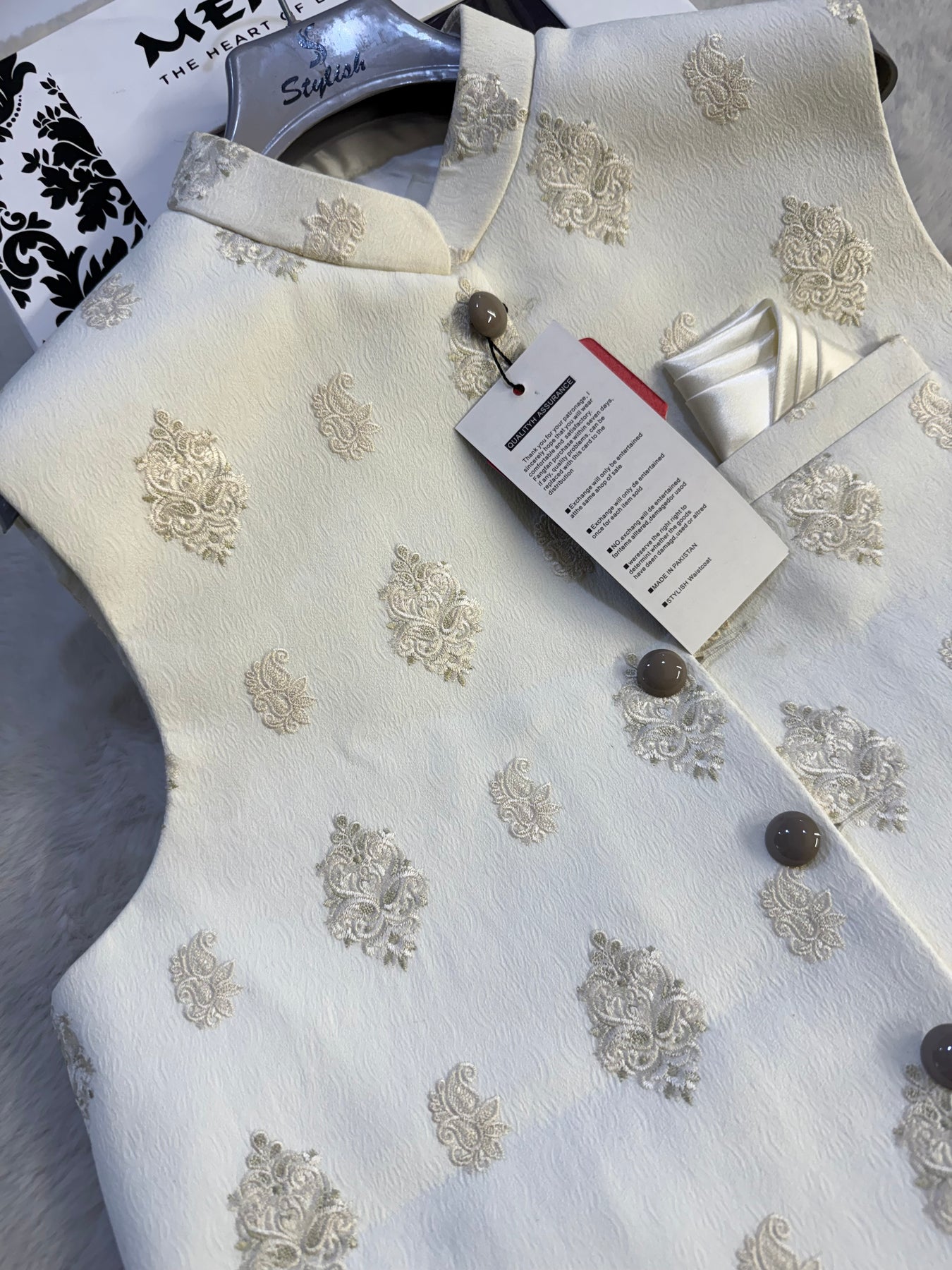 Elevate your traditional look with this exquisite black embroidered waistcoat, crafted for sophistication and style. Featuring intricate floral and geometric embroidery all over, this piece adds a regal touch to any kurta or formal attire..