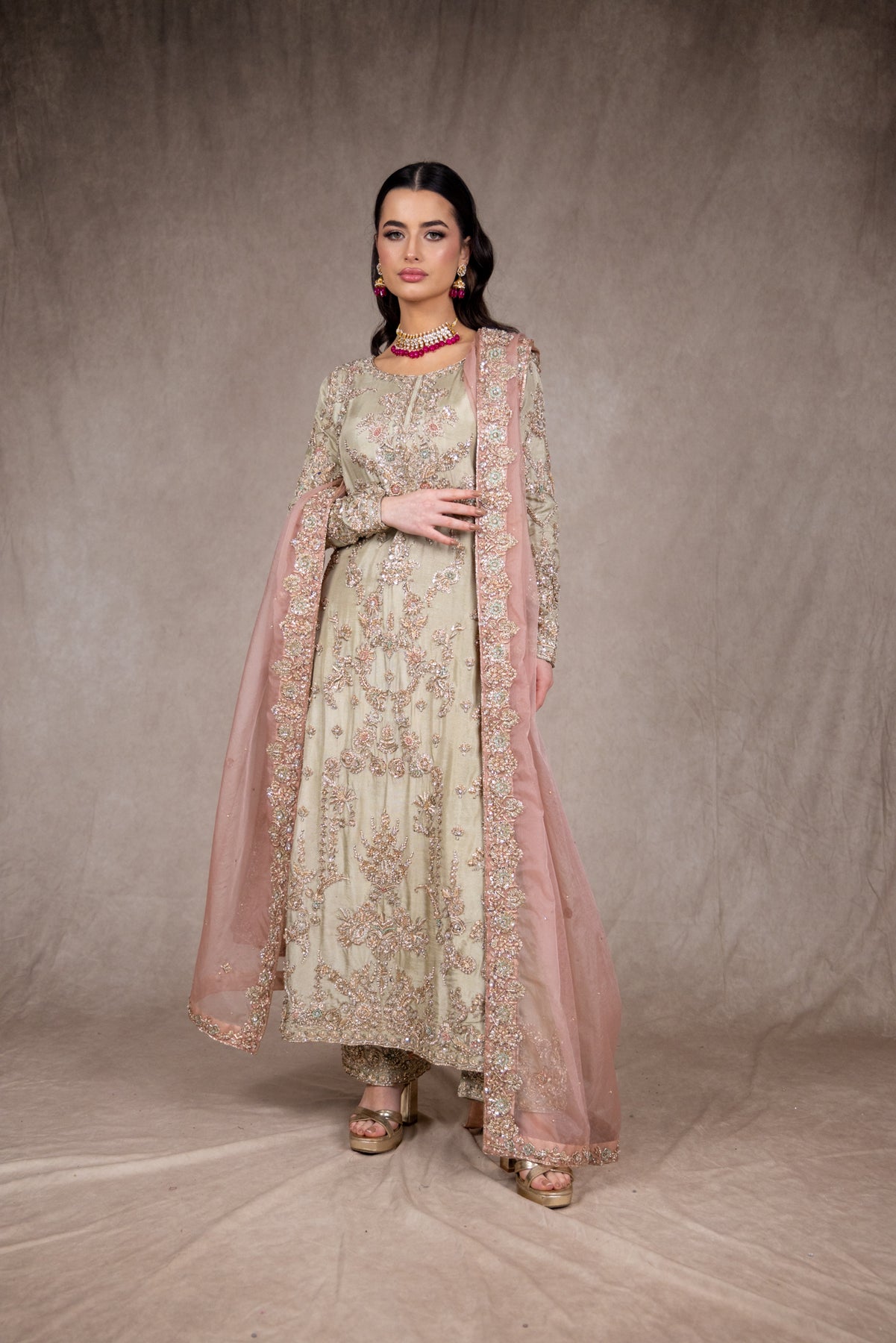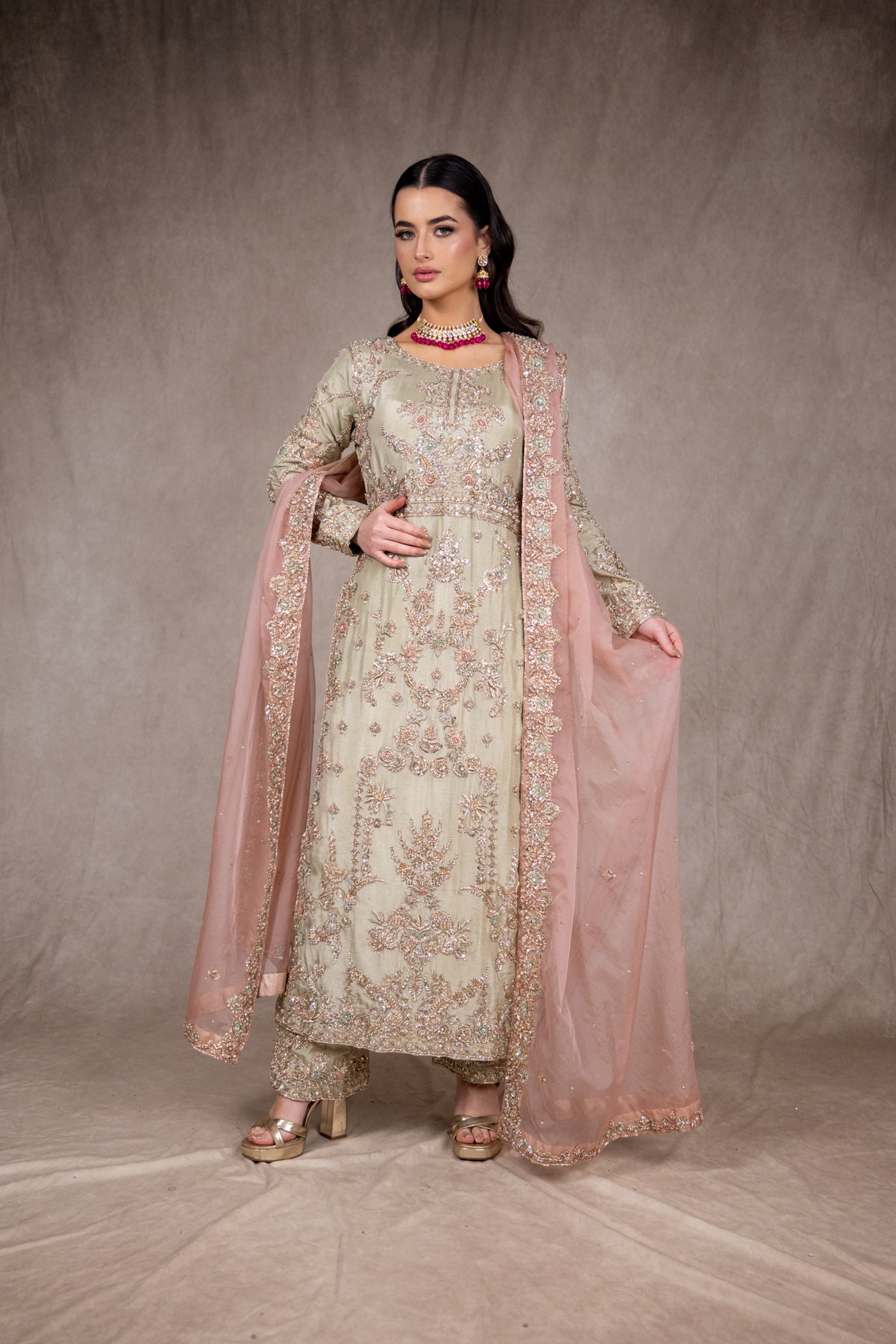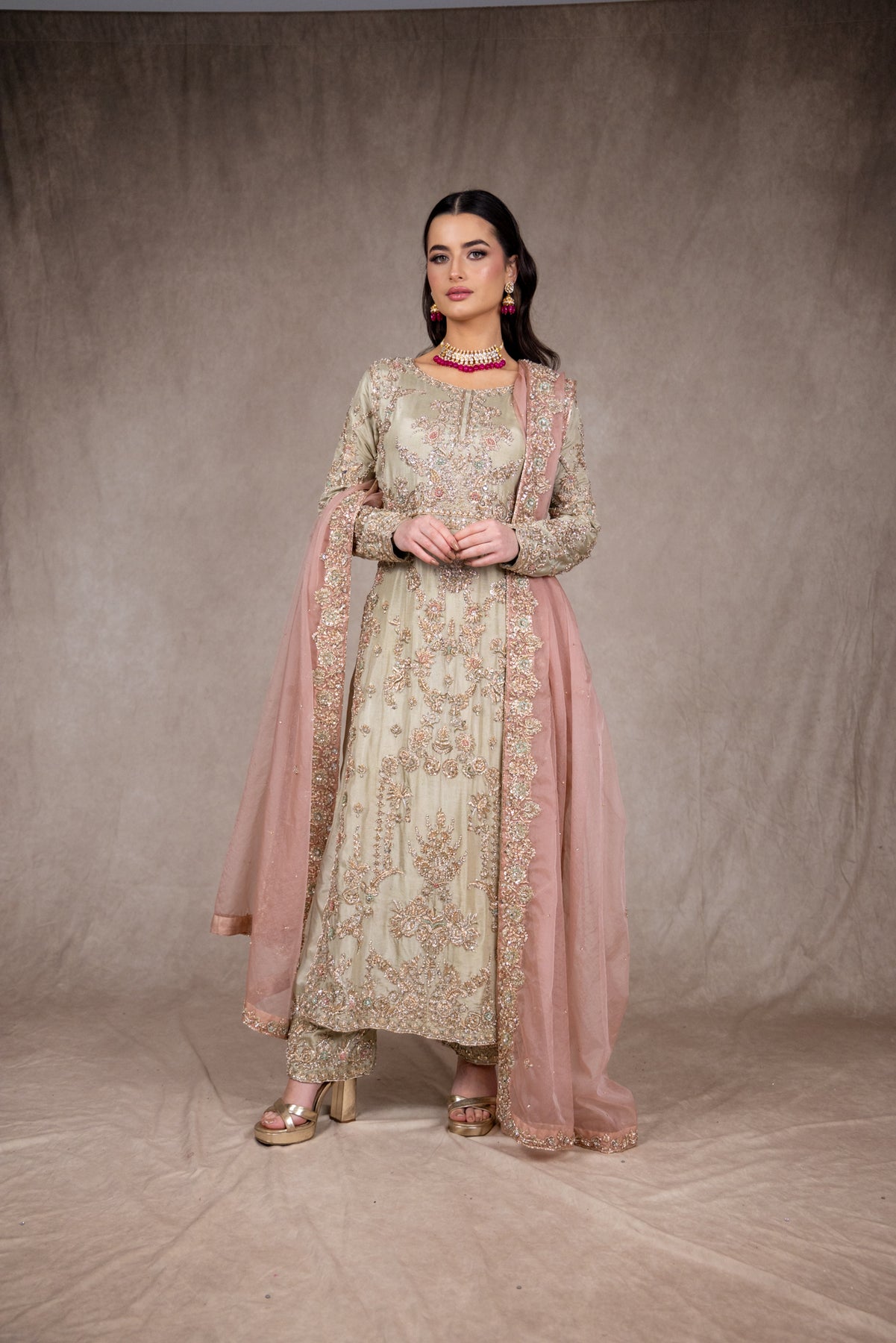 Elevate your formal wardrobe with this stunning three-piece ensemble from Sehrish B Formals. The collection features a luxuriously heavy work shirt paired with an exquisite organza scarf adorned with intricate embroidery that commands attention. Complete the look with beautifully tailored trousers embellished with detailed hand work throughout. Each piece is meticulously crafted to deliver sophistication and elegance for your most important occasions. This is more than just formal wear—it's an investment in timeless style that celebrates traditional craftsmanship with contemporary flair.