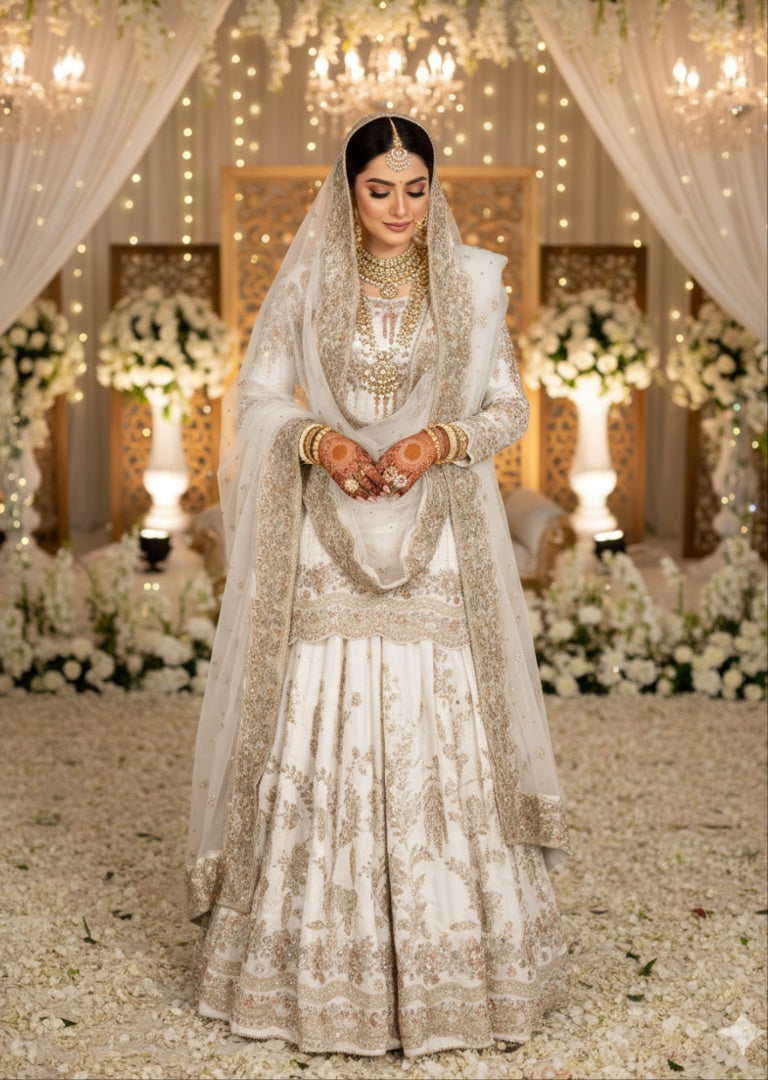 Discover the timeless elegance of this exquisite ghararah, meticulously crafted from pure tusser silk. Each piece showcases a stunning fusion of hand and machine embroidery work, creating intricate patterns that catch the light beautifully. The luxurious fabric drapes gracefully while the detailed embellishments add depth and sophistication to every wear. Perfect for special occasions, this designer piece combines traditional craftsmanship with contemporary style, ensuring you stand out with understated luxury and refined beauty.
