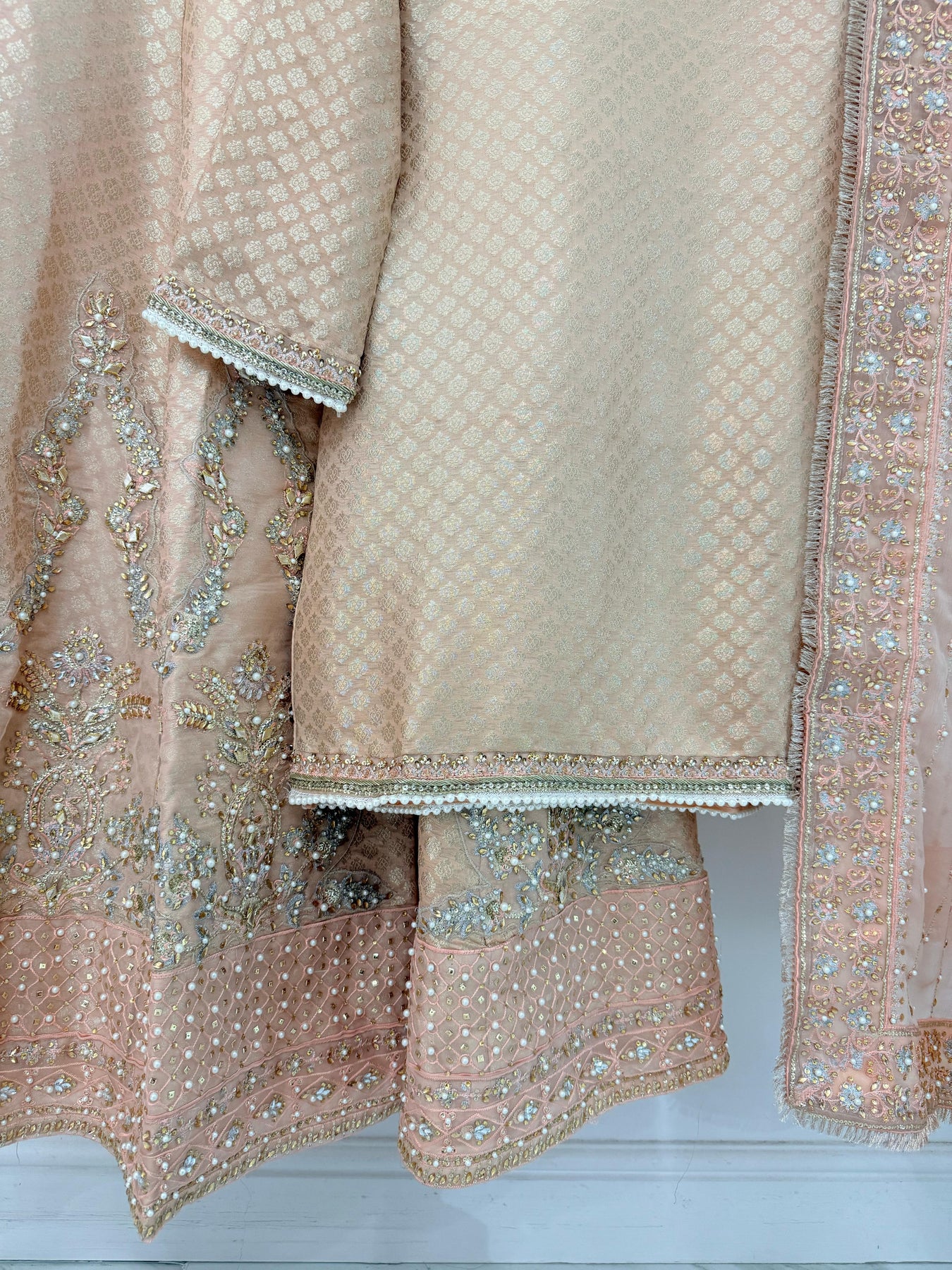Introducing New- the stunning and elegant Peach kameez by Sehrish.B Designer. Adorned with intricate thread and hand embroidery, this outfit will make you stand out in any event.
