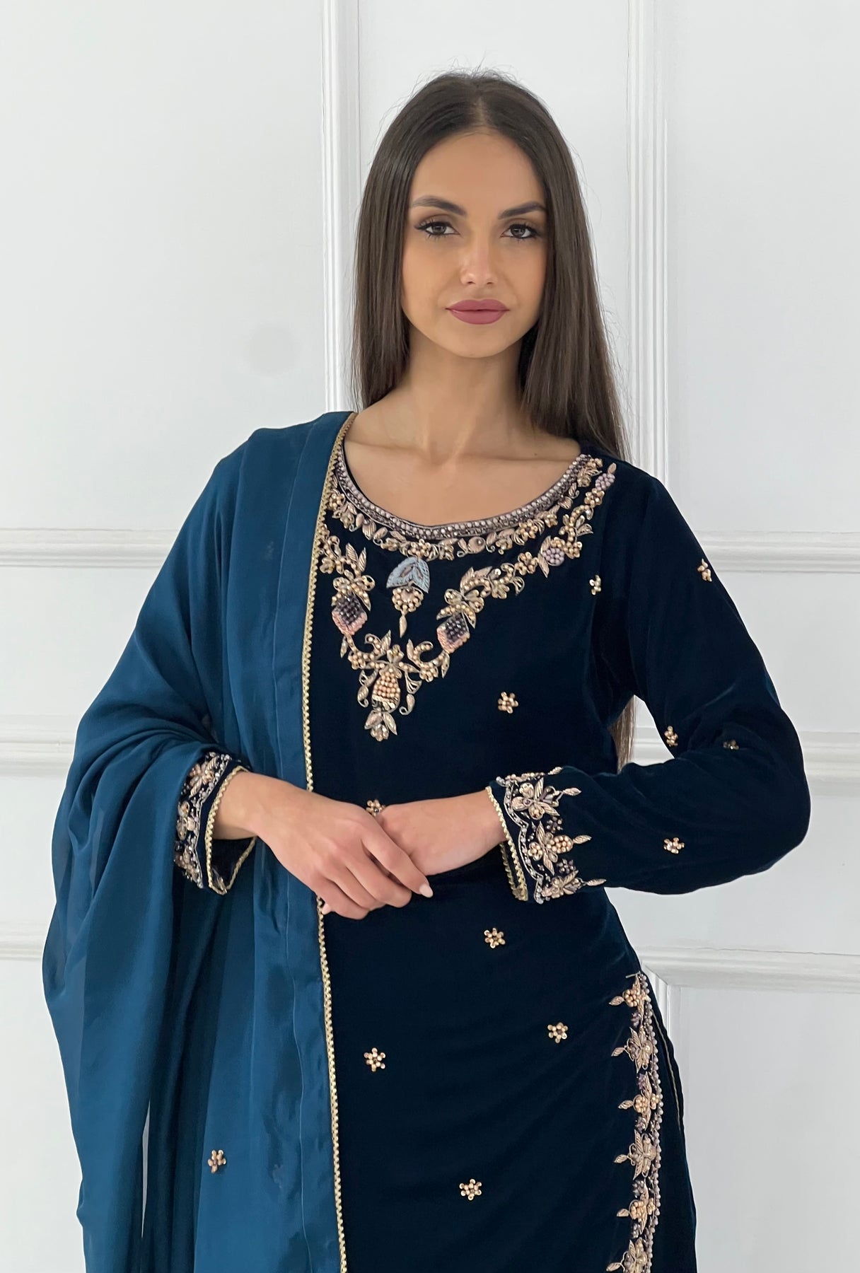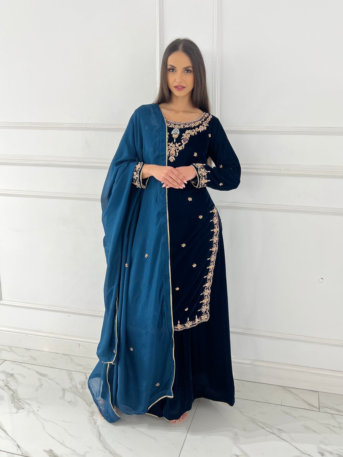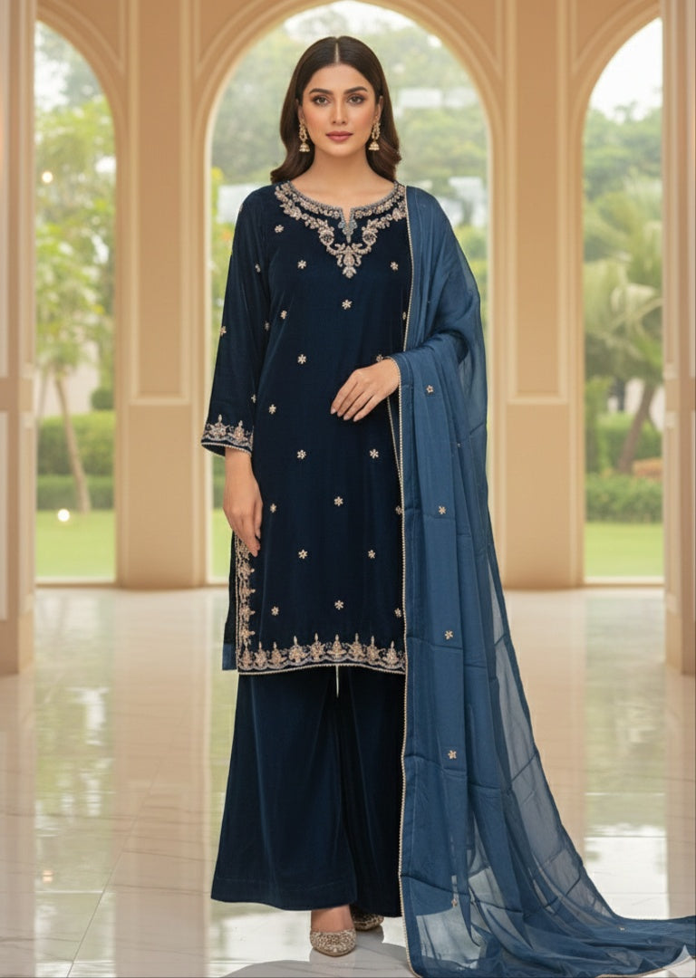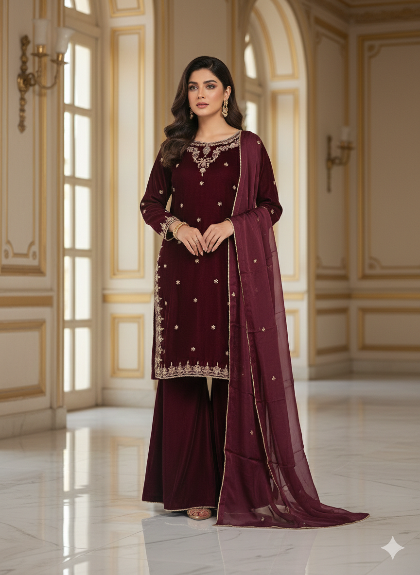 Elevate your formal wardrobe with this stunning three-piece ensemble from Sehrish B Formals 2026 collection. The luxurious velvet kameez features intricate handwork detailing that catches the light beautifully, paired with comfortable velvet palazzo trousers for effortless elegance. Complete the look with the included silk scarf, adding versatility and sophistication to your outfit. Perfect for weddings, celebrations, and special occasions, this collection piece combines traditional craftsmanship with contemporary style. Experience the richness of premium fabrics and expert artisanal work that makes a lasting impression.