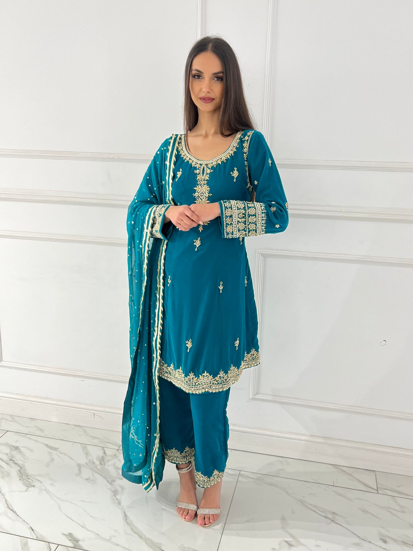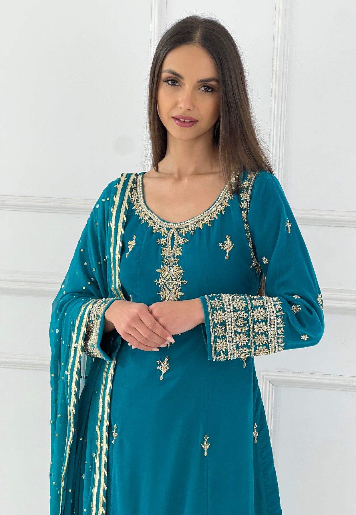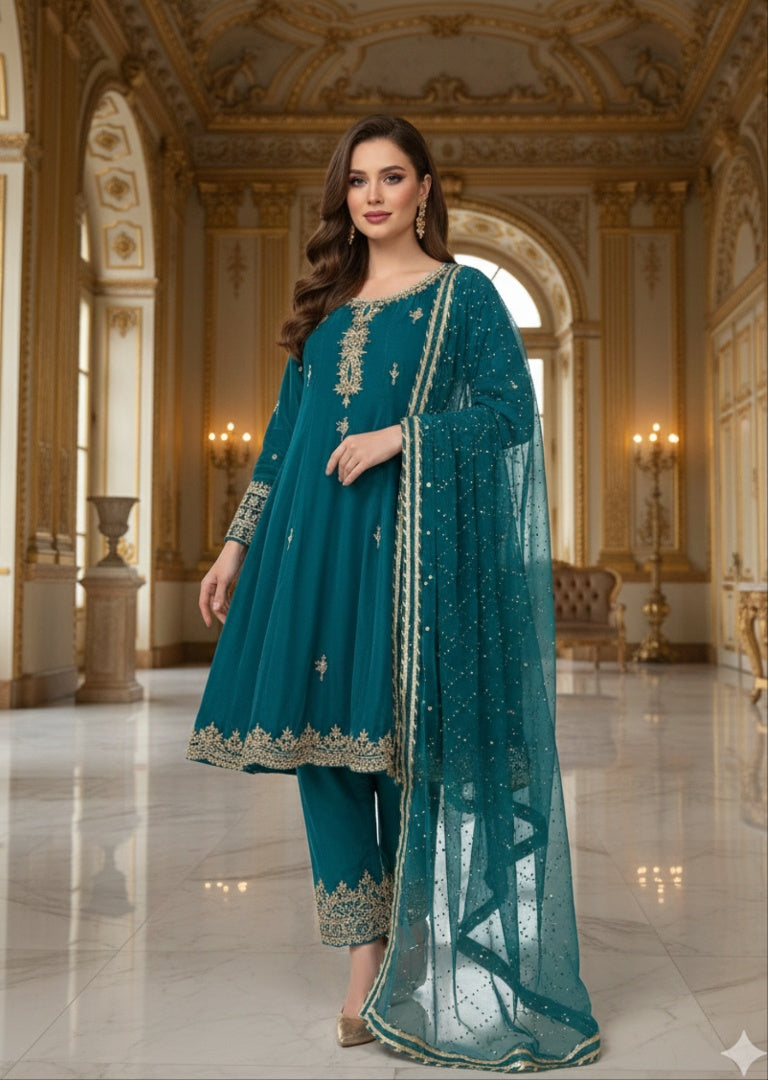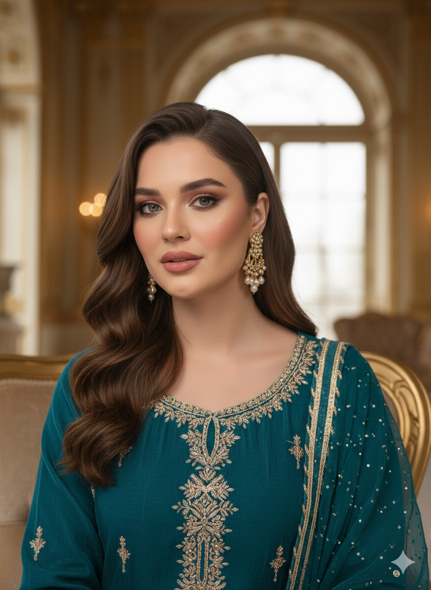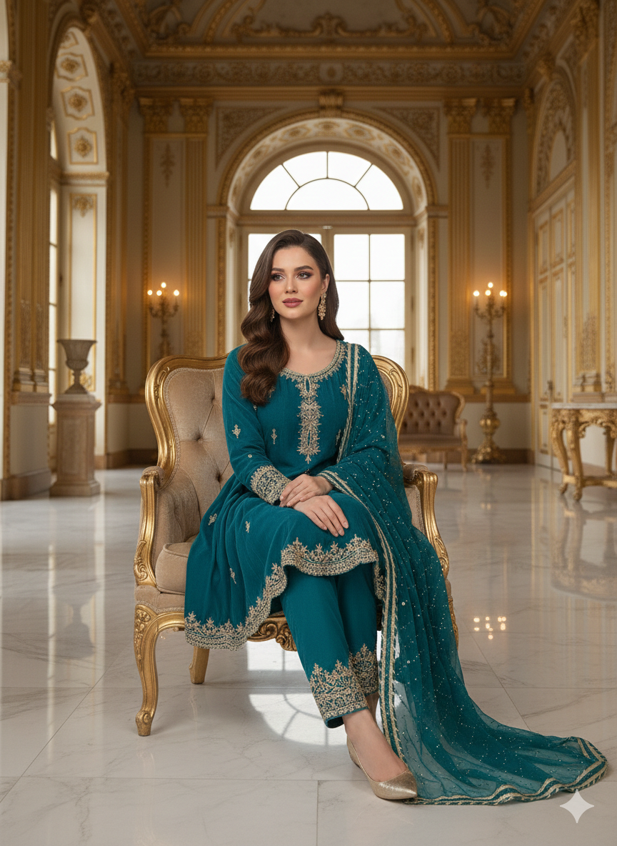 Elevate your formal wardrobe with this stunning three-piece ensemble from Sehrish B Formals 2026. The luxurious velvet peplum dress features exquisite hand-embroidered detailing that commands attention, while the accompanying chiffon scarf showcases delicate makesh work for an added layer of sophistication. Complementing the look, the trousers are adorned with matching intricate embroidery, creating a cohesive and refined silhouette. Perfect for weddings, celebrations, and special occasions, this collection piece combines traditional craftsmanship with contemporary elegance, ensuring you stand out with timeless grace and unparalleled style.