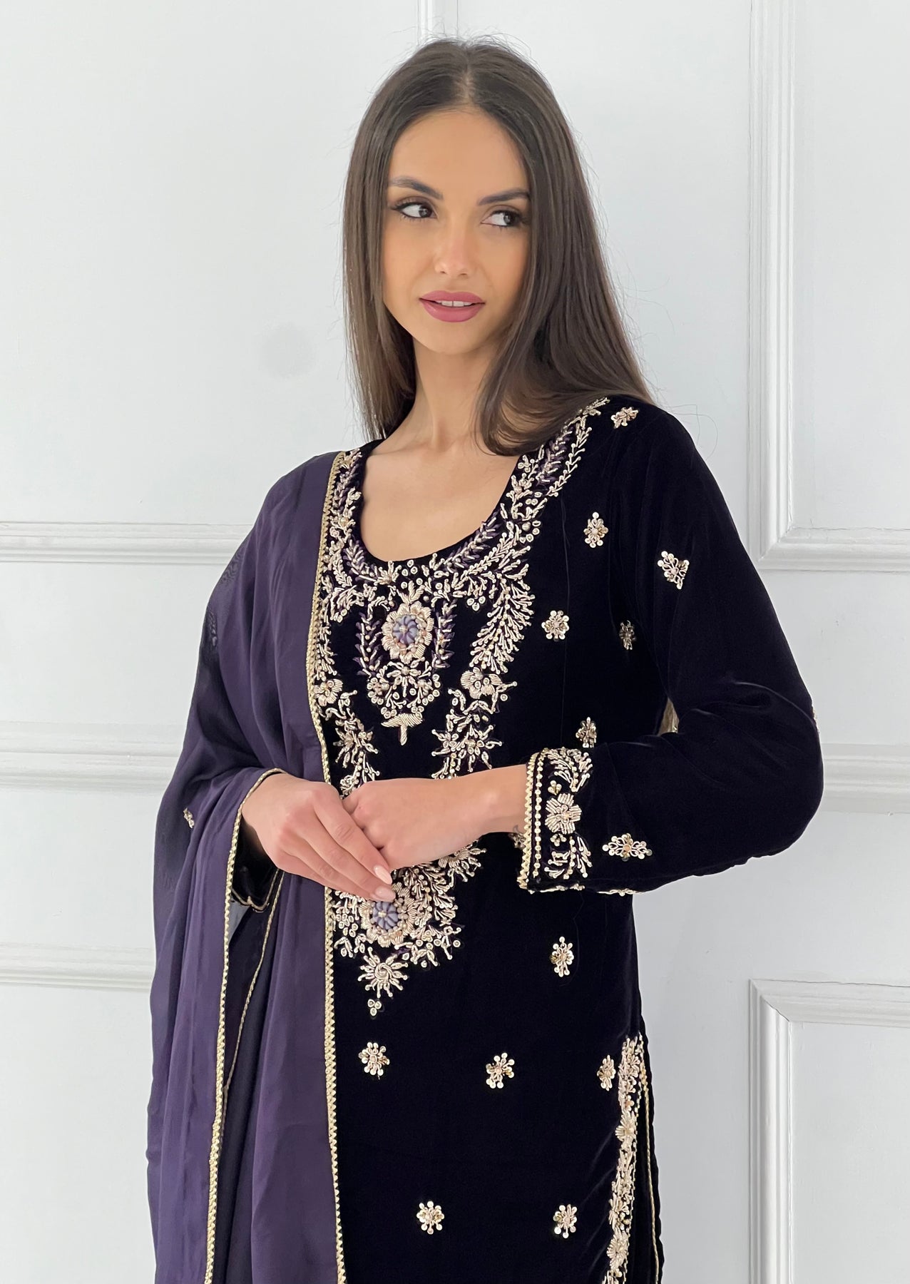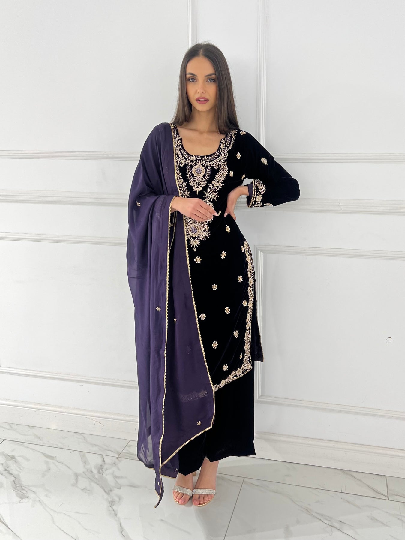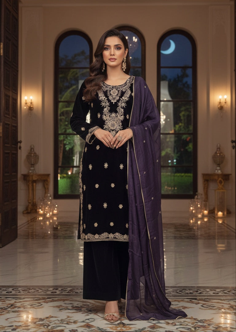 Kameez: A long, black velvet tunic (kameez) featuring intricate silver or pale gold embroidery. The most prominent detail is the ornate floral chest piece, complemented by scattered motifs across the body and a decorative border at the hem and cuffs.