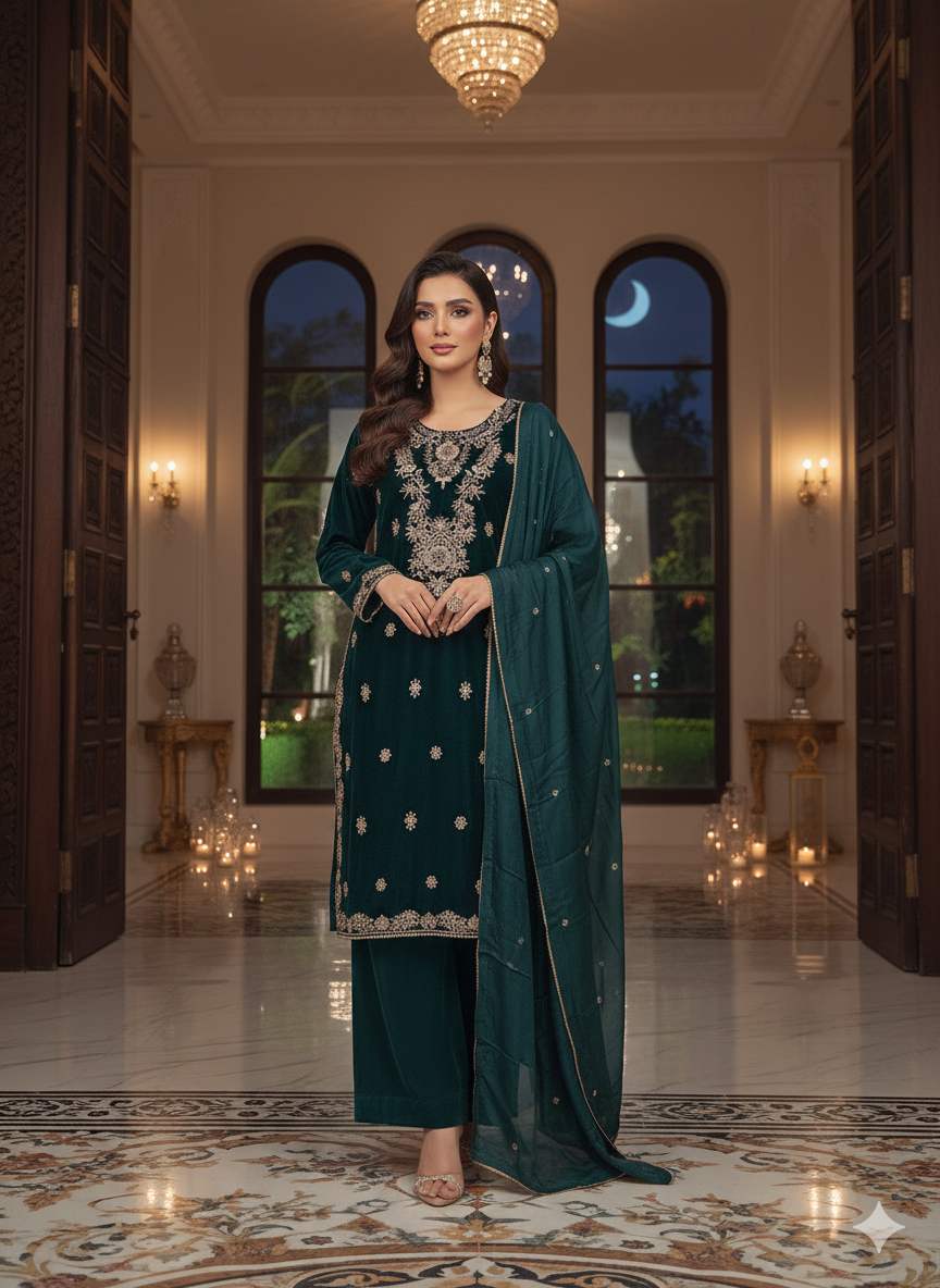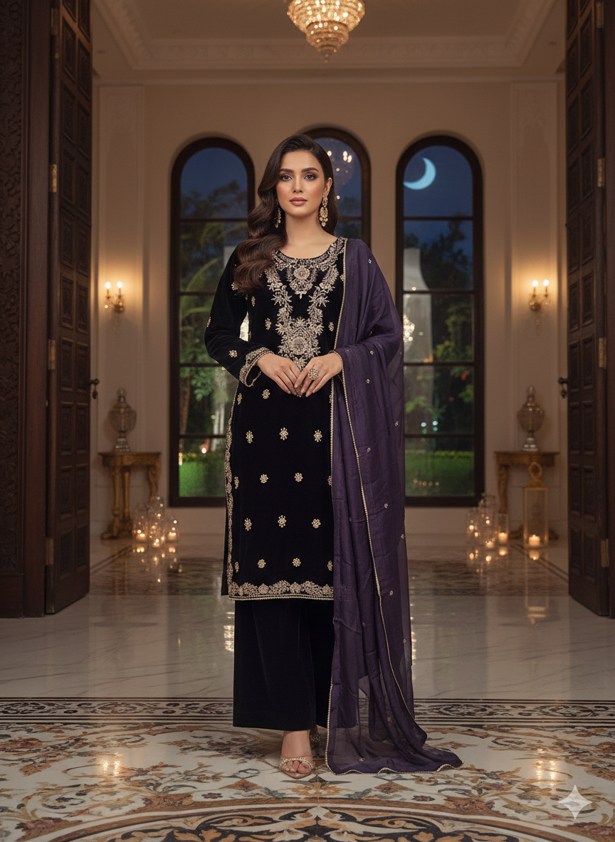 Dupatta: A sheer Silk dupatta draped over one shoulder, adding a subtle touch of color and texture to the dark palette.