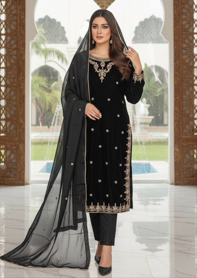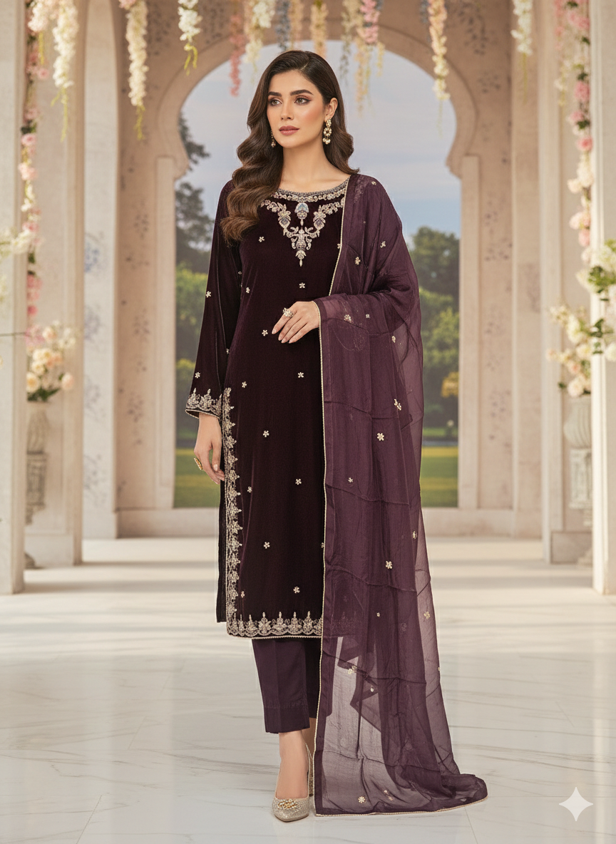 Elevate your formal wardrobe with this stunning ensemble from Sehrish B Formals 2026. The luxurious velvet long shirt features intricate hand-embroidered detailing that showcases exceptional craftsmanship, while the coordinating velvet trousers create a sophisticated silhouette. Perfect for weddings, celebrations, and special occasions, this coordinated set combines timeless elegance with contemporary design. The soft velvet fabric drapes beautifully, ensuring comfort without compromising on style. Make a lasting impression with this refined two-piece that effortlessly transitions from formal events to upscale gatherings.