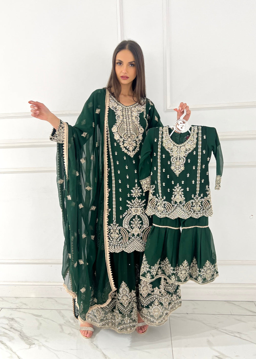Experience the joy of matching outfits with your little one in our New Chiffon Embroidered Mummy n Me Outfit. Made with lightweight chiffon and adorned with intricate ghotta work, this stunning outfit will make you and your child stand out in any gathering. Perfect for creating unforgettable memories together!