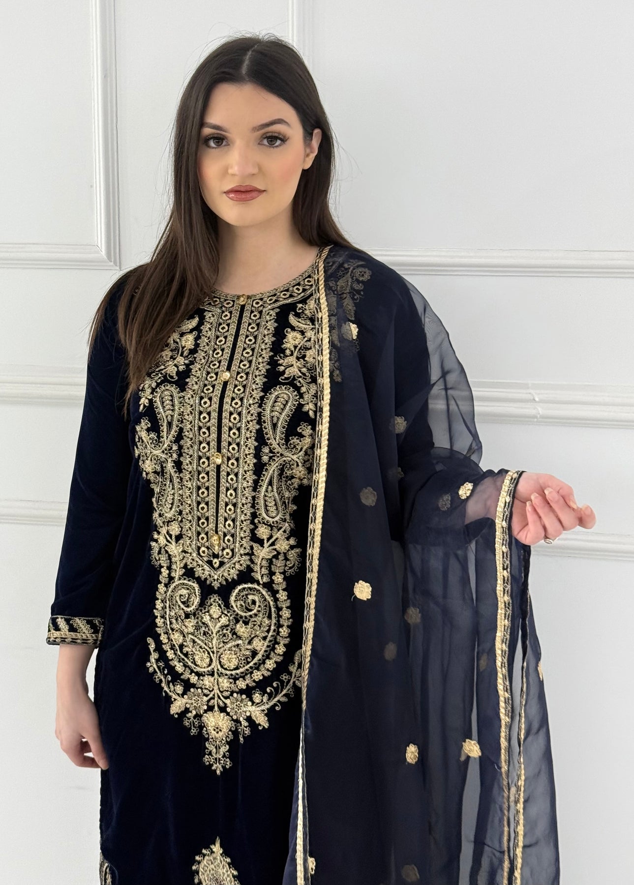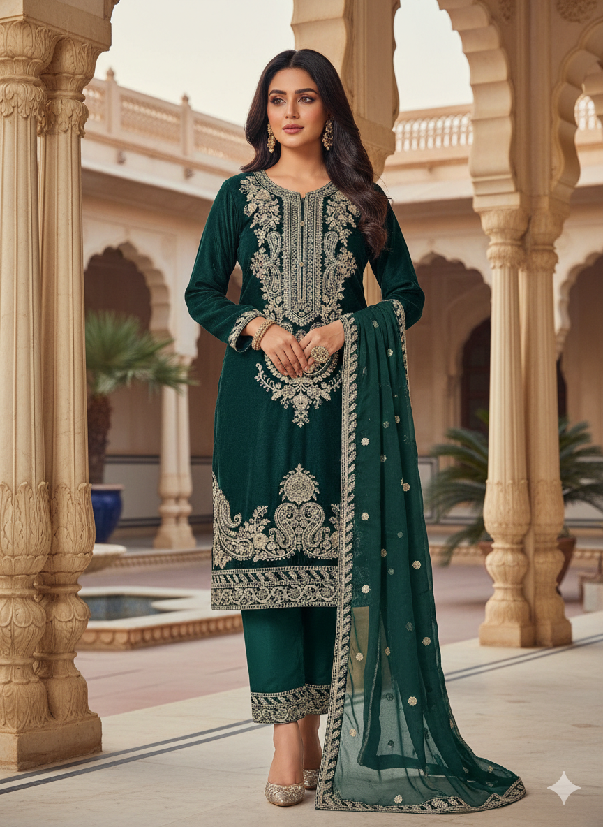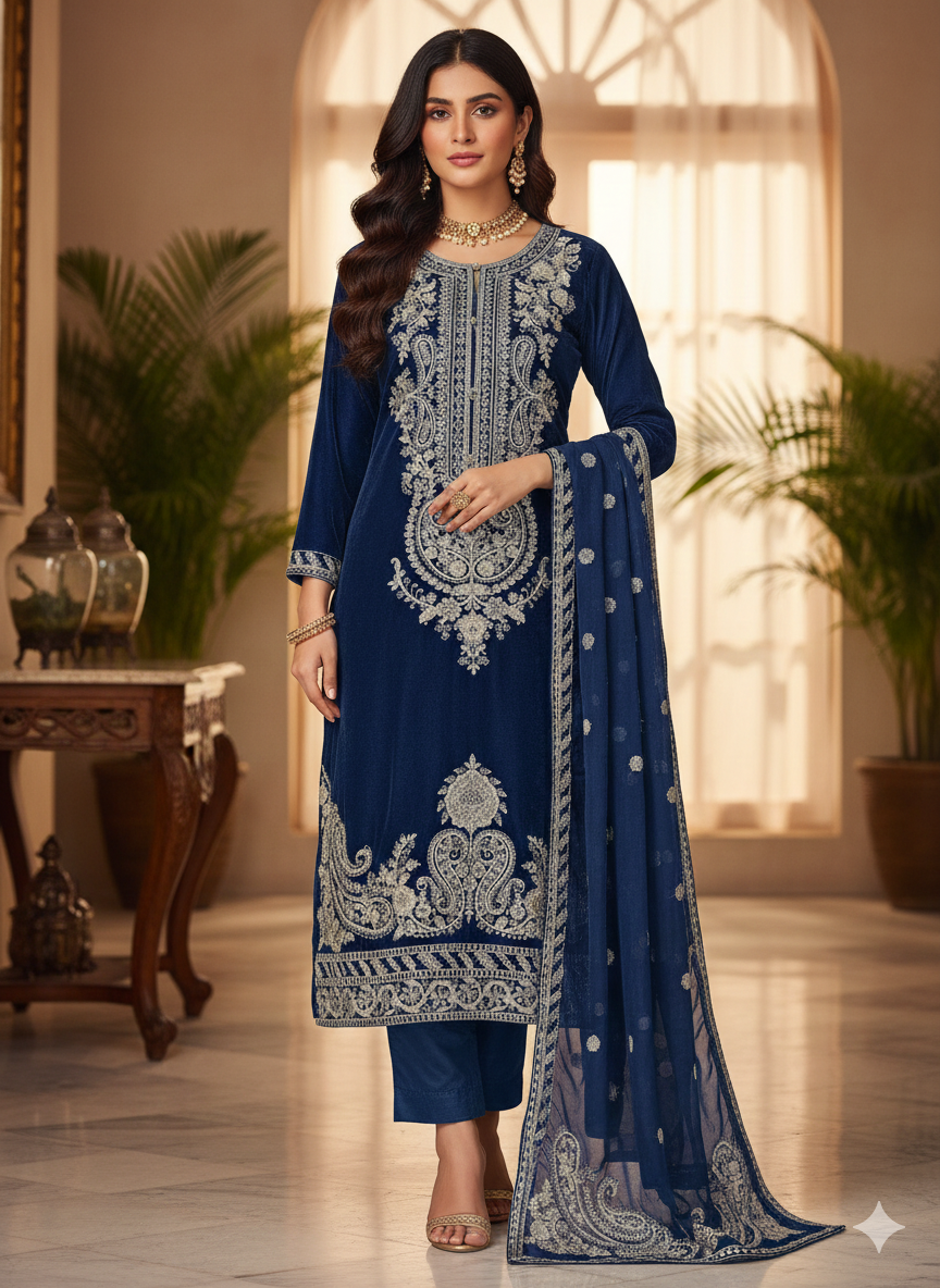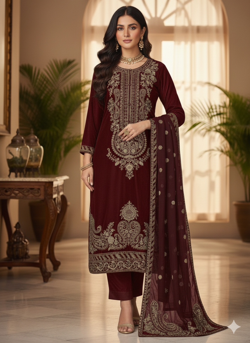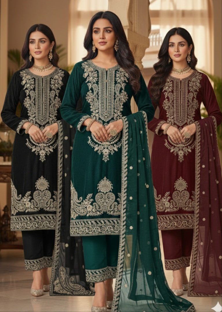Elevate your wardrobe with our HK356 Readymade Velvet Outfit, a luxurious choice for the modern woman. Crafted from sumptuous velvet fabric, this sophisticated ensemble combines comfort with timeless elegance. Perfect for special occasions, festive celebrations, or making a statement at any gathering, this ready-to-wear piece requires no tailoring. The rich texture and refined design ensure you'll stand out while feeling confident and poised. Embrace effortless style without compromising on quality or glamour.