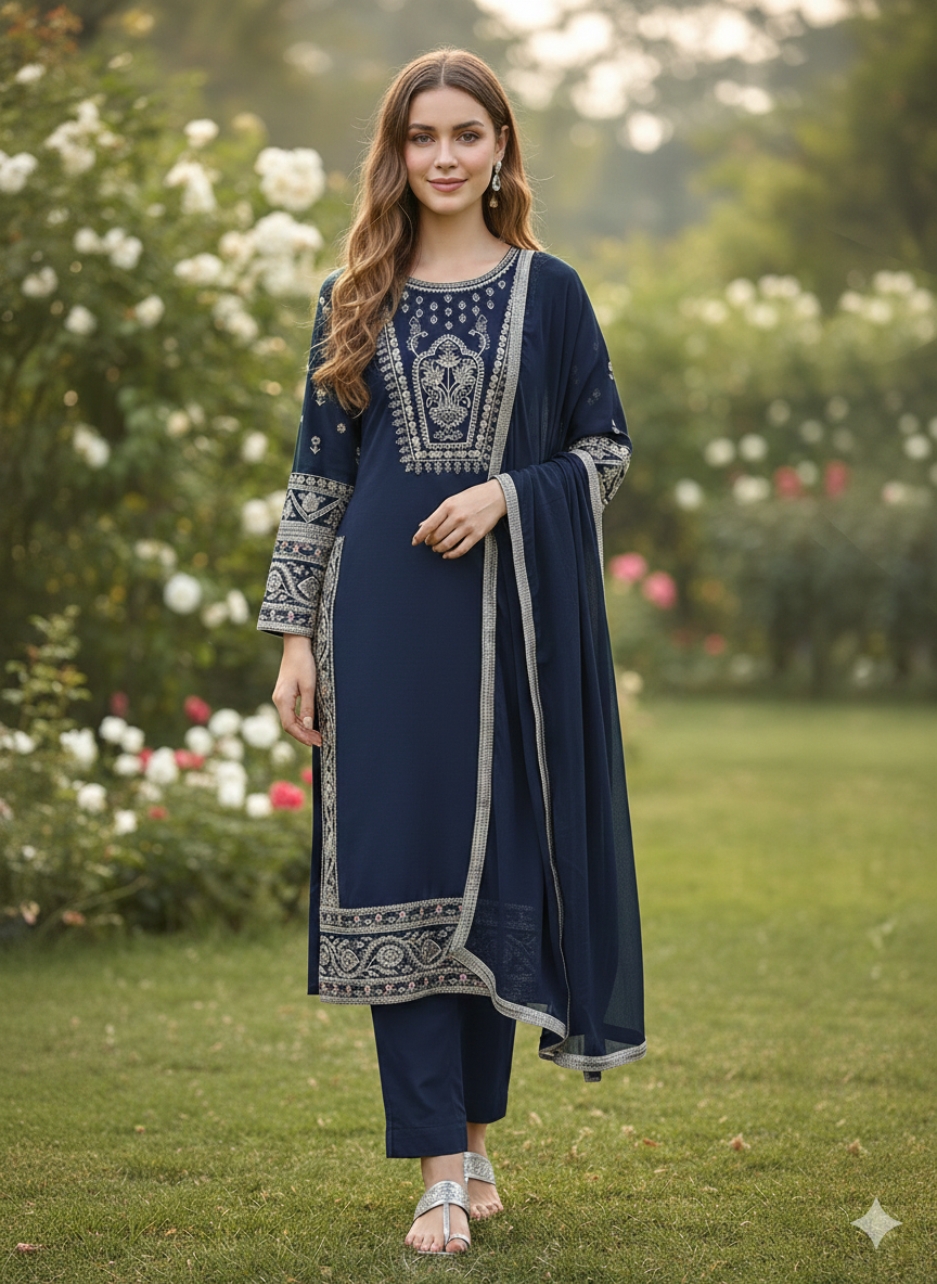 Accessories: Please note that stitched/unstitched suits may or may not include accessories. Some accessories shown in images are for modeling purposes only and may not be included with the suits.