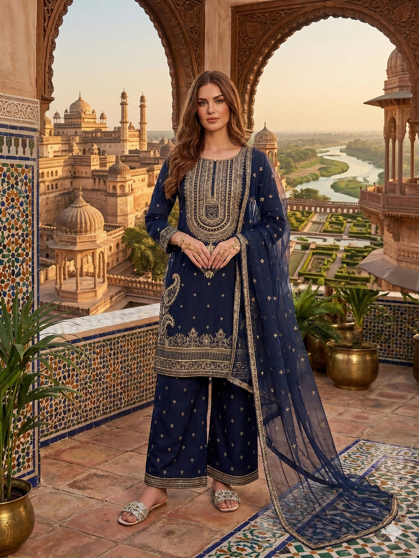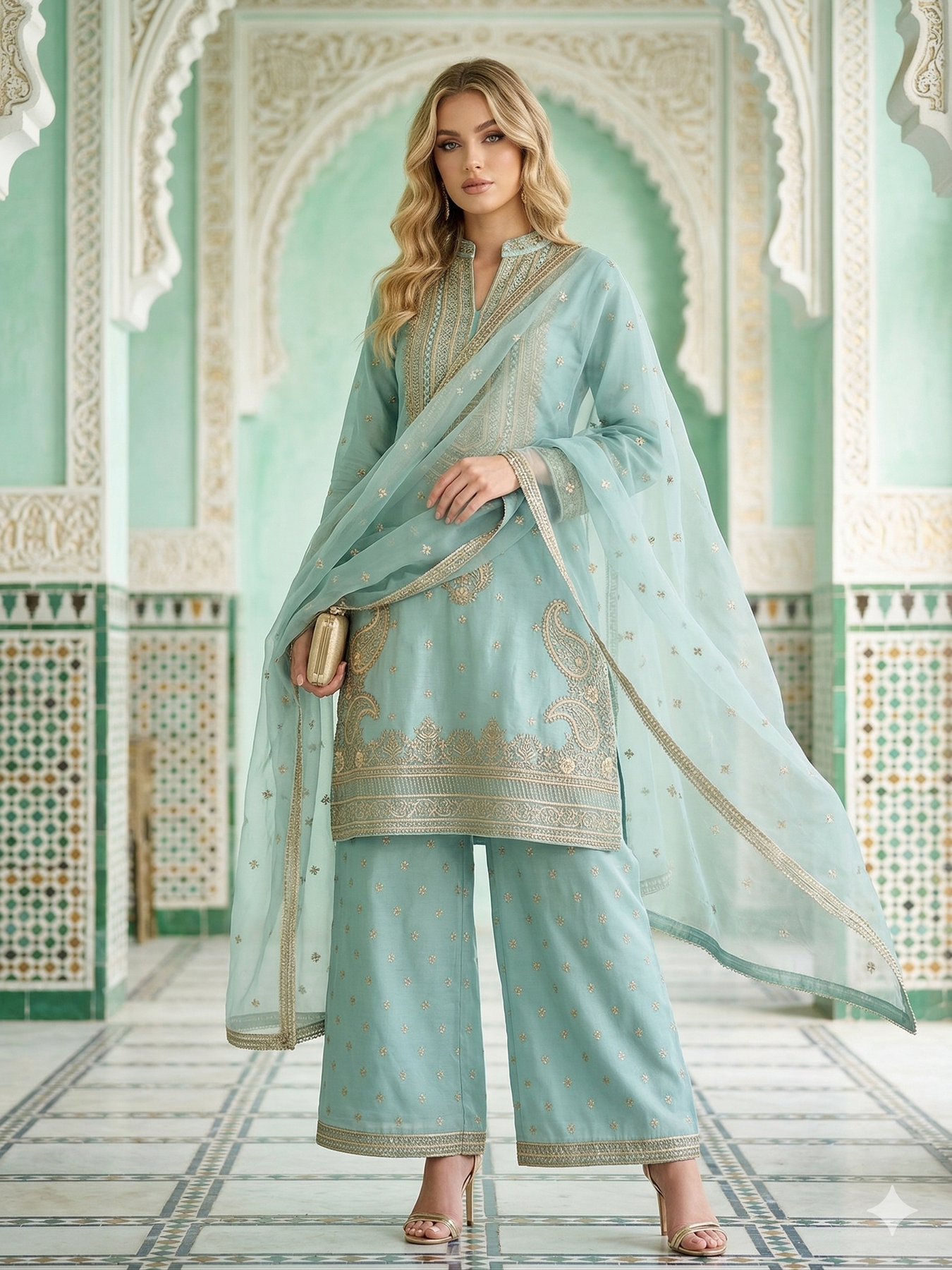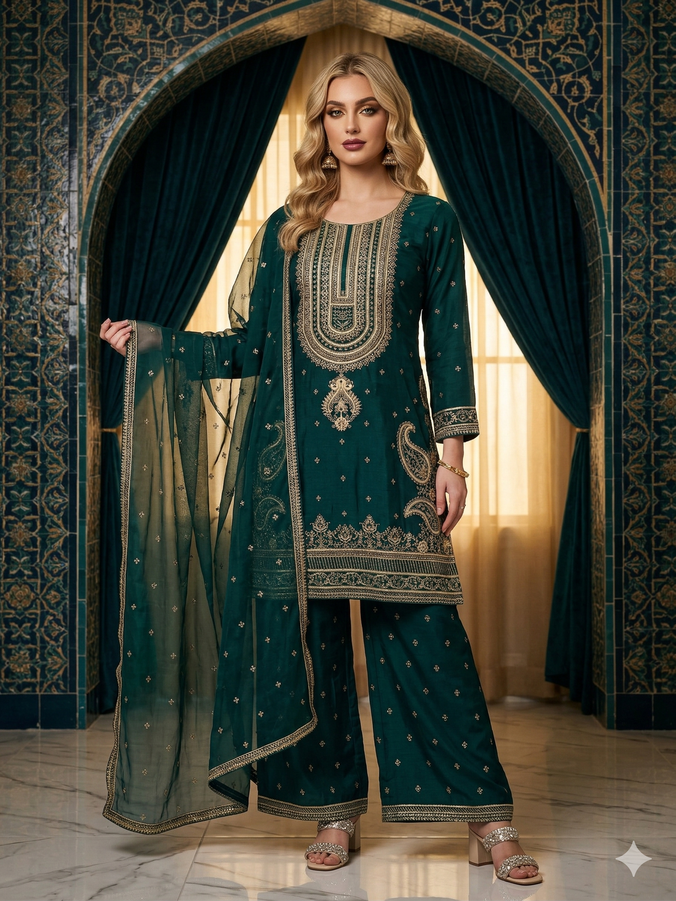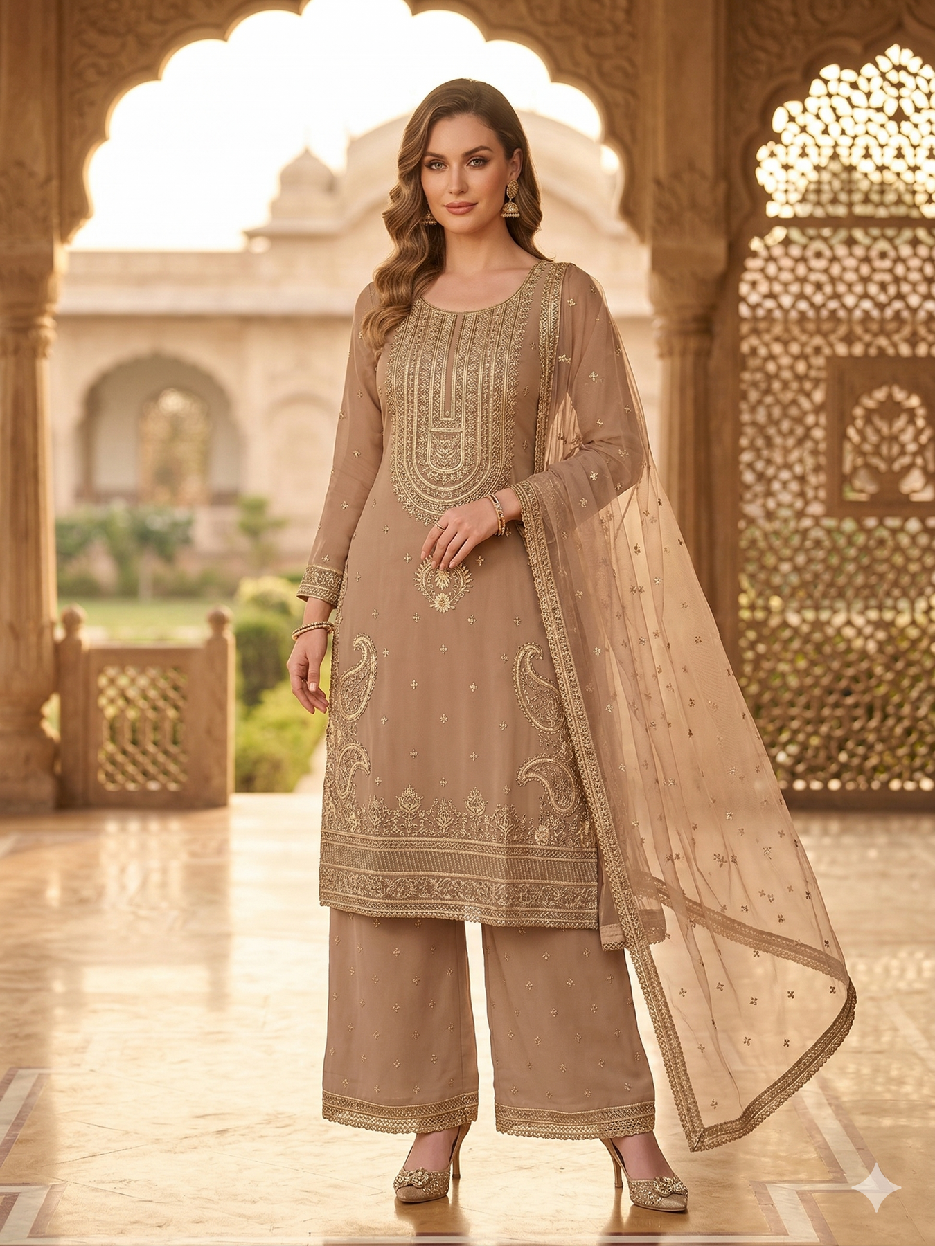 A stunning 3-piece traditional embroidered linen suit designed with elegant detailing for a timeless look. This outfit features wide palazzo trousers for a graceful silhouette, paired with a beautifully embroidered organza dupatta that adds a touch of sophistication.