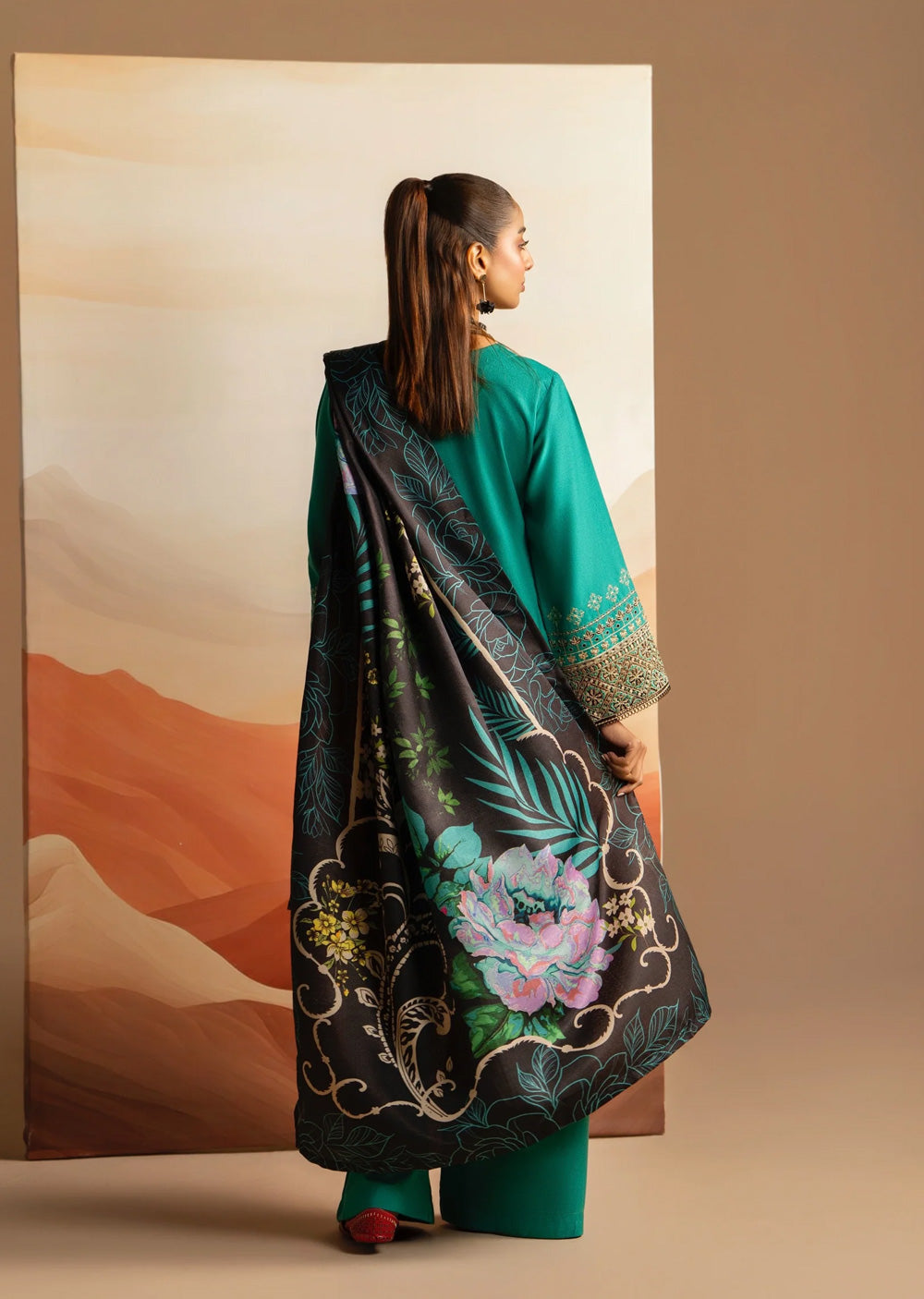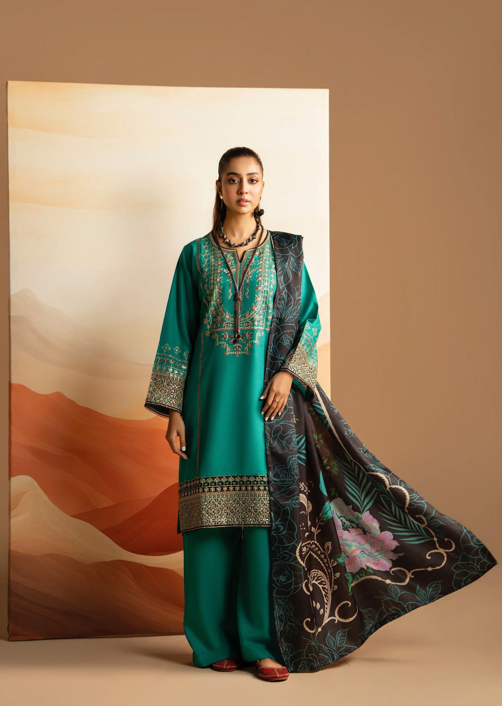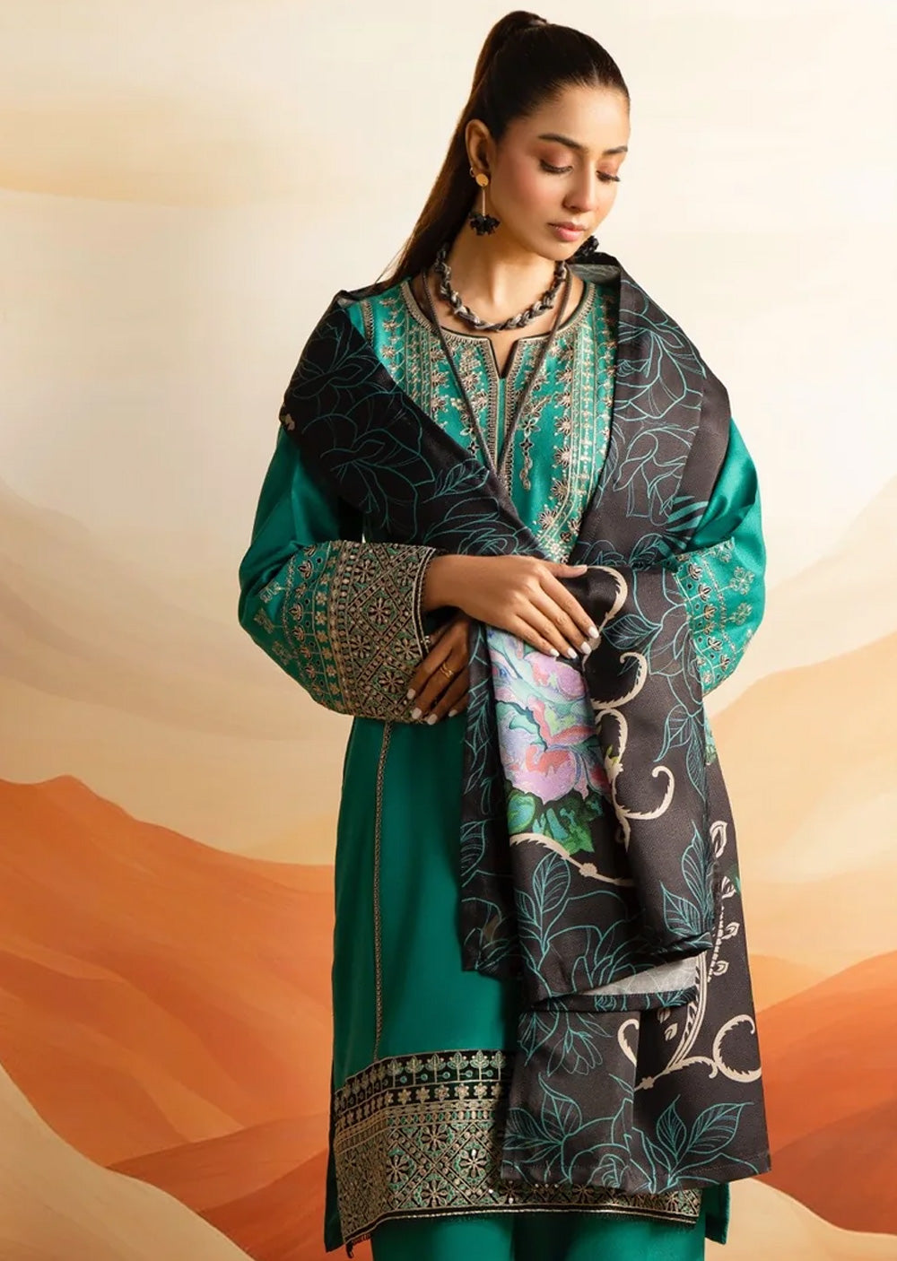 This elegant dhanak suit features a geometric-embroidered kameez with traditional tassels and matching shalwar. The look is elevated by a luxurious pashmina grip dupatta, finished with a vibrant turquoise trim and a rich floral