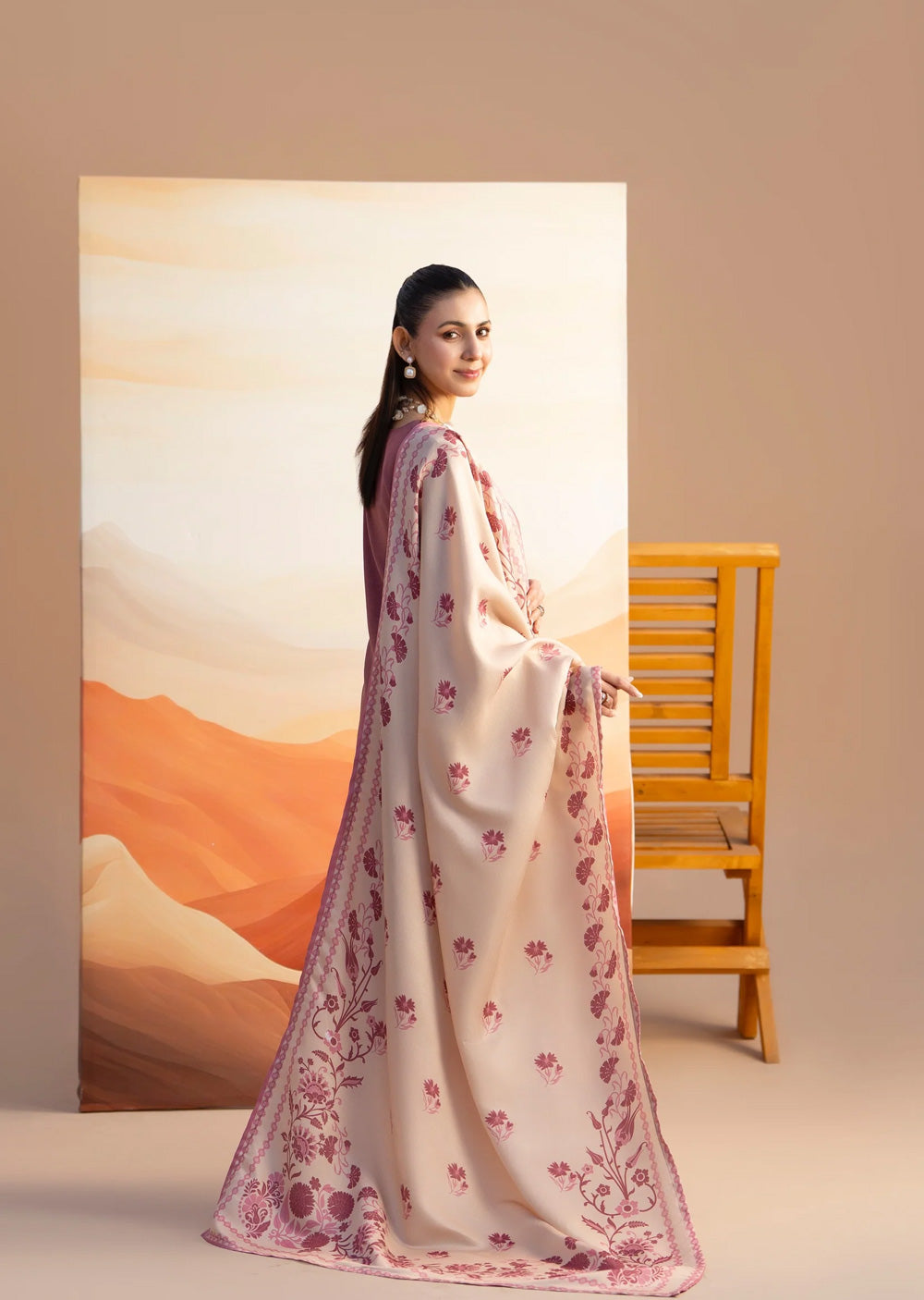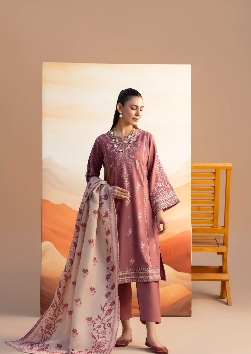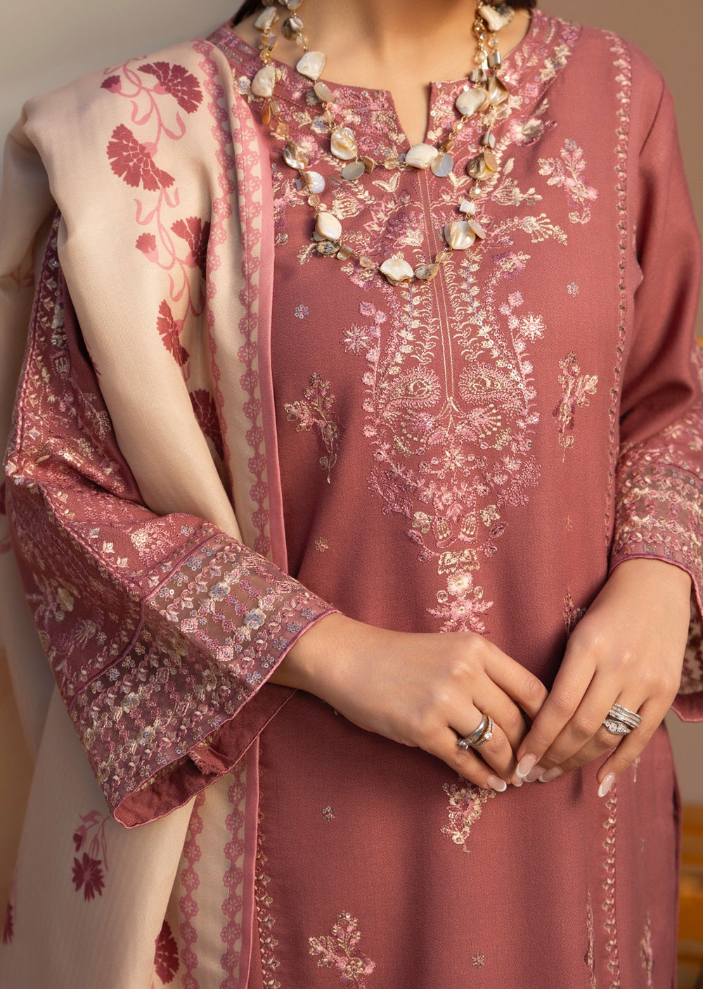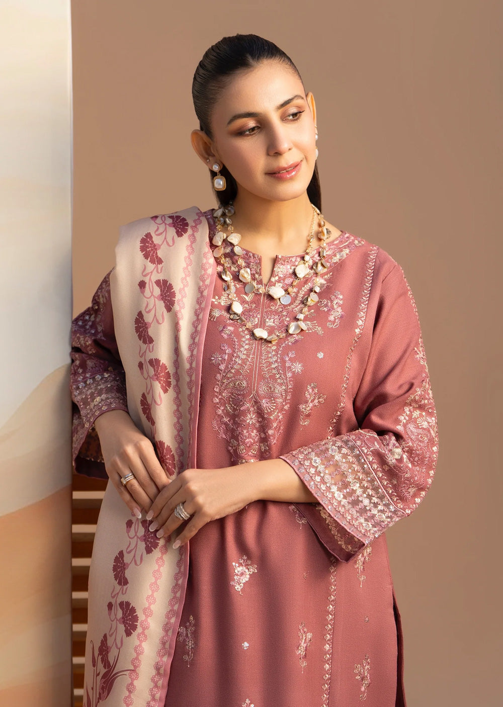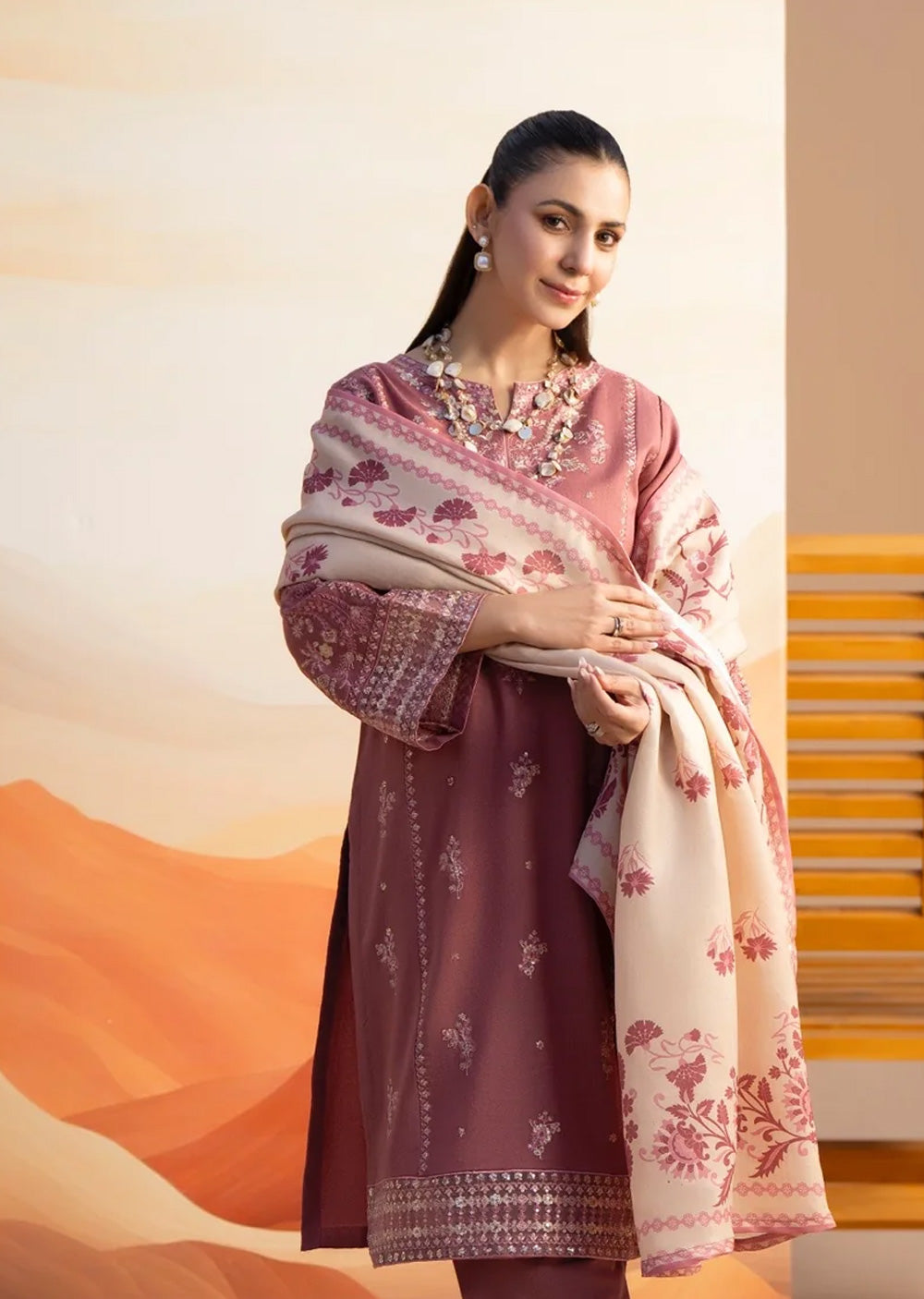 This elegant dhanak suit features a geometric-embroidered kameez with traditional tassels and matching shalwar. The look is elevated by a luxurious pashmina grip dupatta, finished with a vibrant turquoise trim and a rich floral