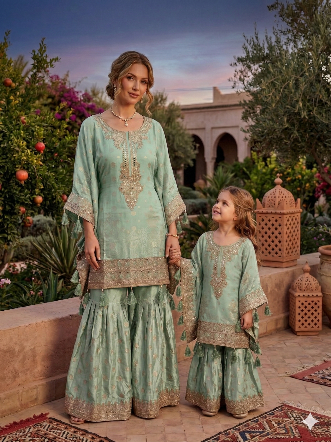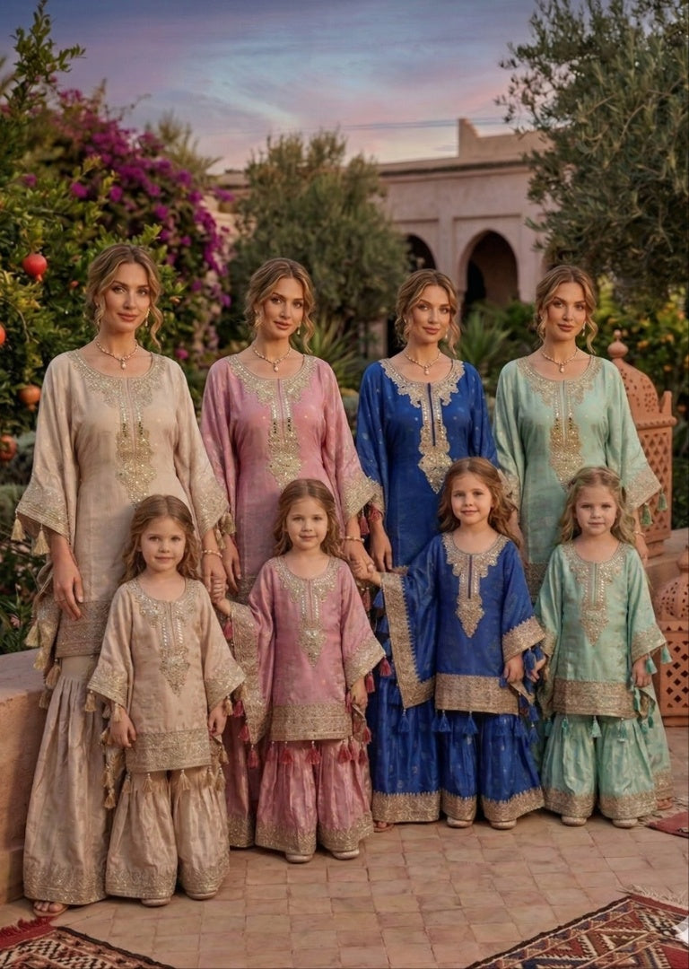 Luxurious kaftan outfits crafted from rich jacquard fabric, beautifully detailed with mirror work and intricate thread and tilla embroidery for an elegant, statement finish.