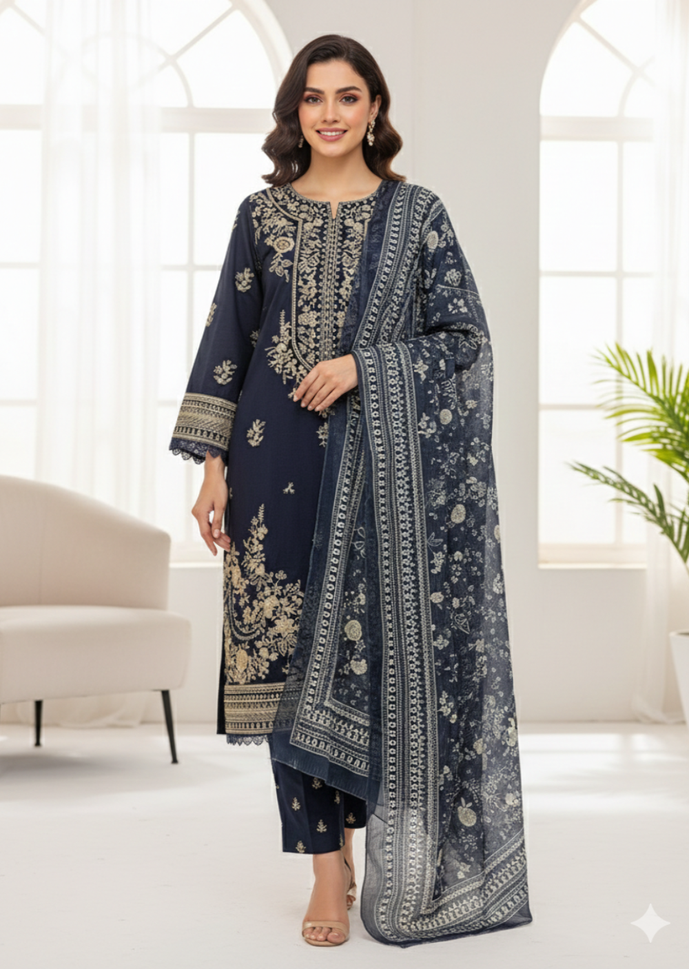 Accessories: Please note that stitched/unstitched suits may or may not include accessories. Some accessories shown in images are for modeling purposes only and may not be included with the suits.