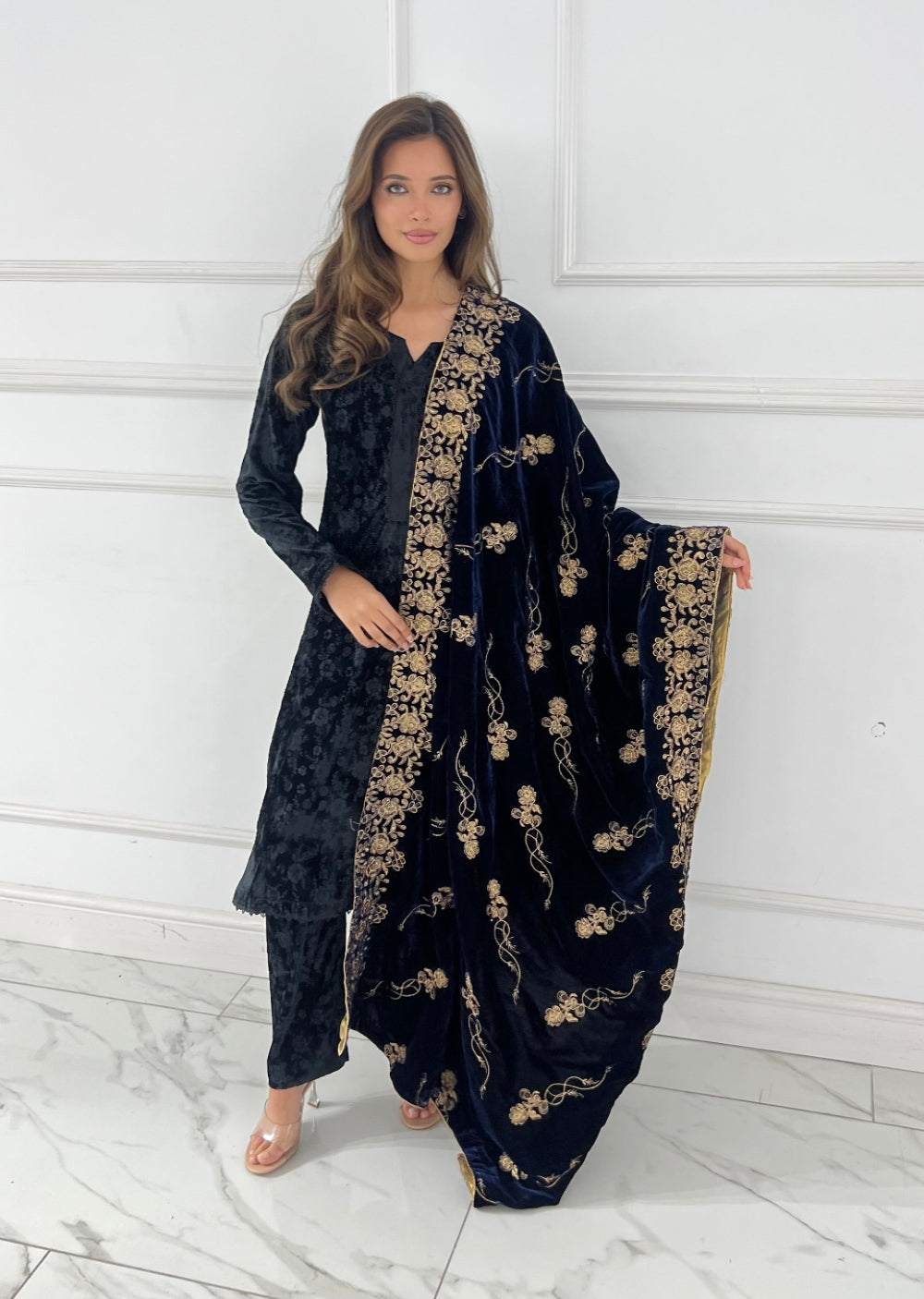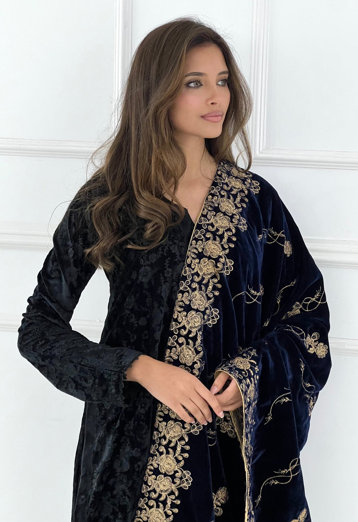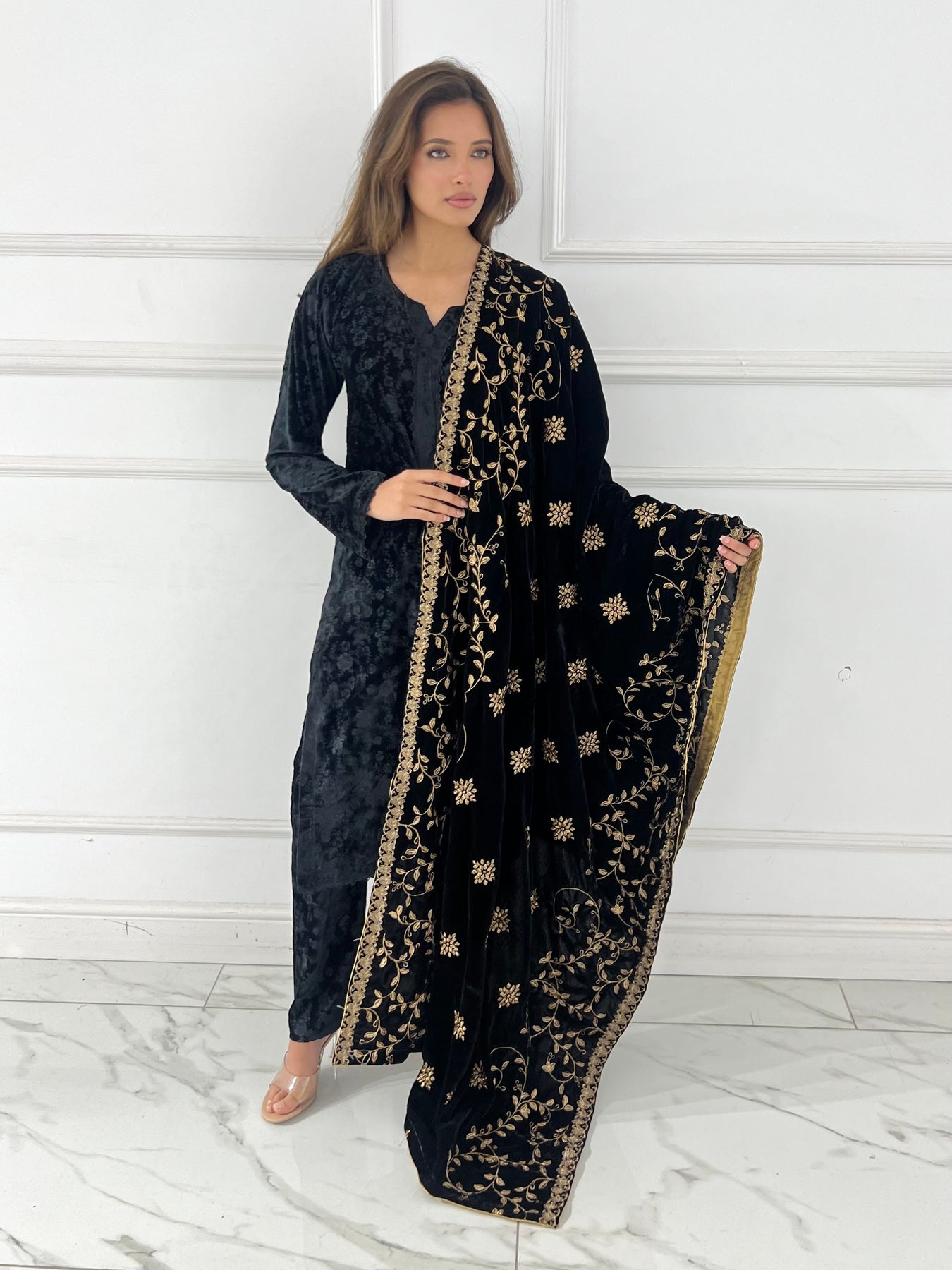 Experience elegance with this beautifully crafted velvet shawl adorned with exquisite embroidery.