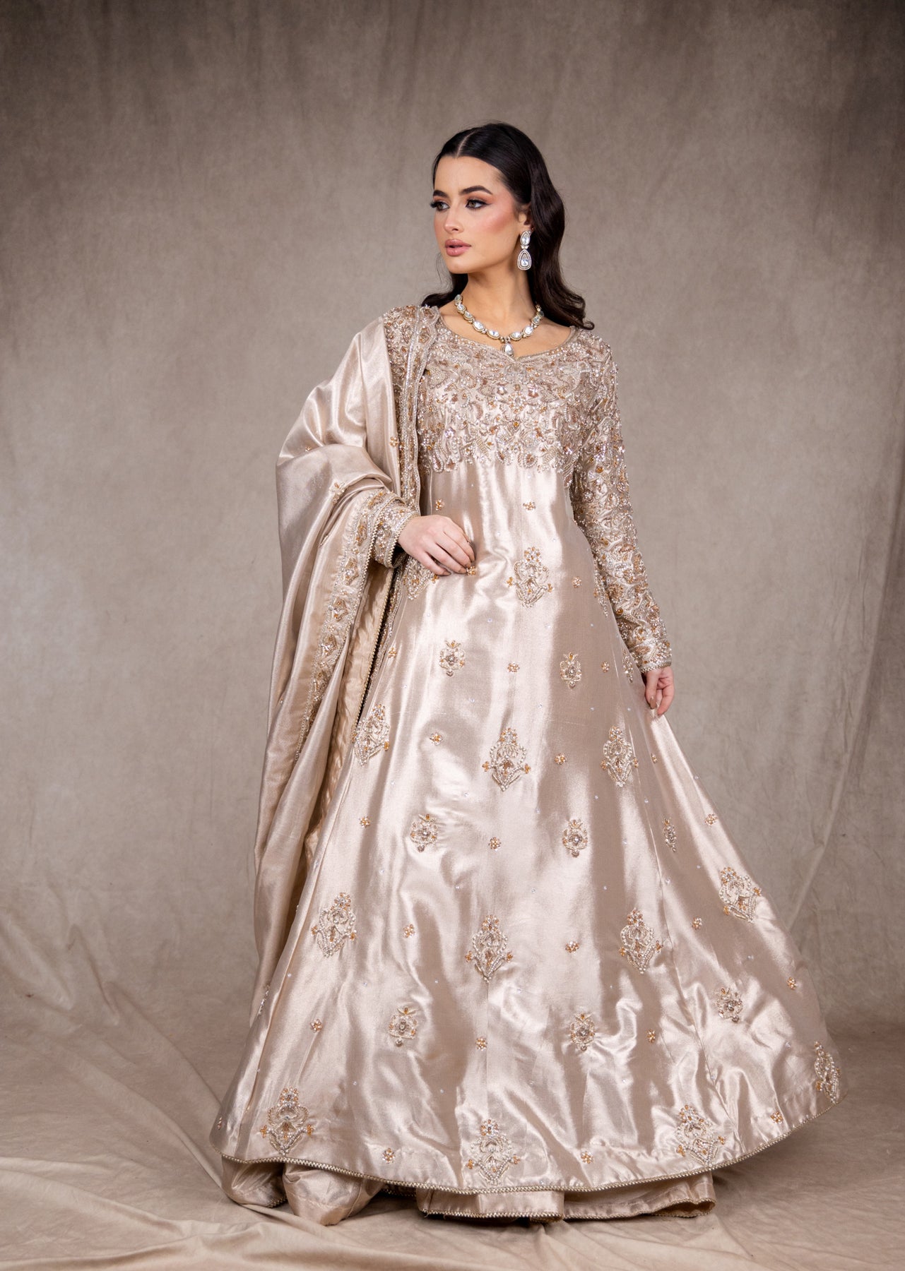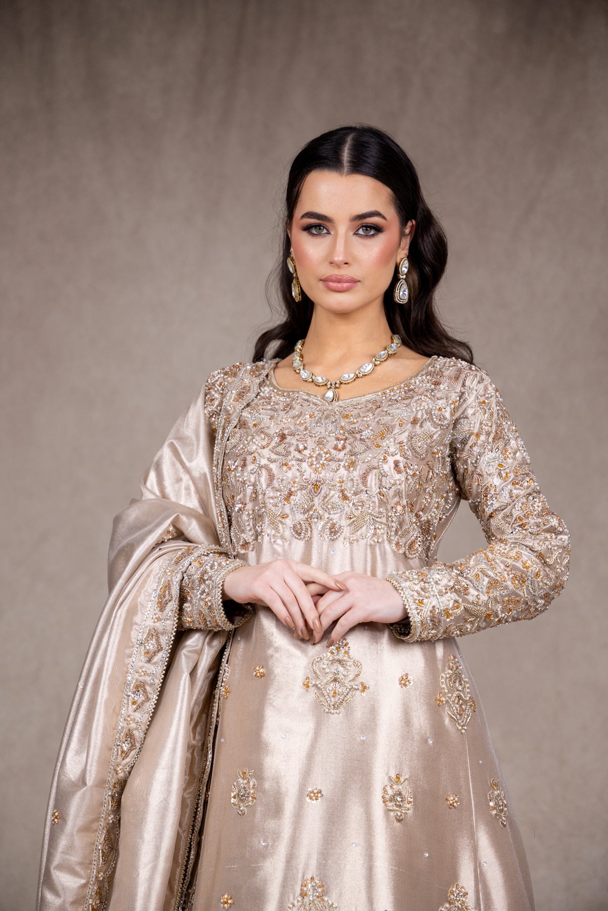 Introducing the SRB2616 Izza, a breathtaking formal ensemble that epitomises timeless elegance. Crafted from luxurious pure zari tissue, this stunning long dress and skirt showcase exquisite artisanal craftsmanship. Every inch is adorned with intricate hand embroidery featuring shimmering stones, delicate dabka work, and lustrous pearls that catch the light beautifully. The ensemble is completed with a heavily embroidered zari tissue scarf, perfectly coordinated to elevate your look. Ideal for weddings, celebrations, and special occasions, this piece combines traditional artistry with contemporary sophistication, ensuring you make an unforgettable impression.