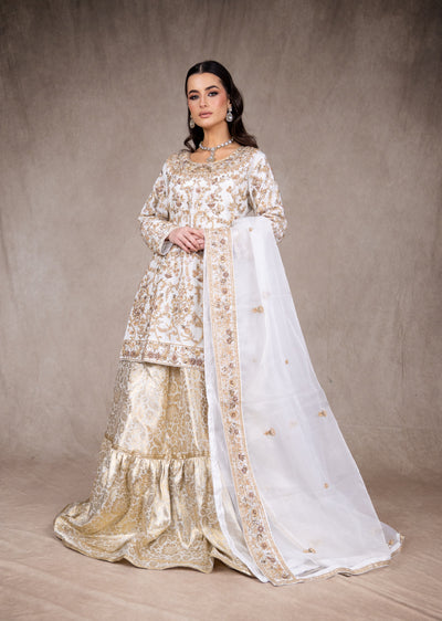 • Intricate Hand-Embellishment: The kameez is richly adorned with intricate Zari  and Dabka/Moti (bead/sequin) embroidery. This detailed work covers the front panel, hemline, and sleeves, showcasing exceptional artisanal skill.