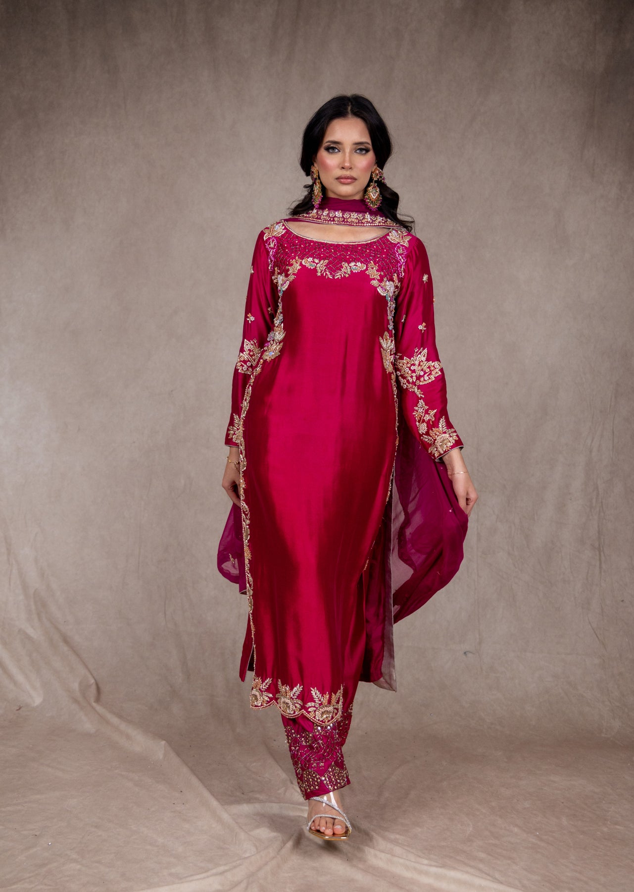 Introducing the SRB2622 Kaviya, an exquisite creation from the Sehrish B Design 2025 collection. This stunning long kameez is meticulously crafted from pure silk, offering unparalleled elegance and comfort. Adorned with intricate handwork embroidery that showcases traditional artistry, each piece tells a story of craftsmanship and sophistication. The ensemble includes a graceful chiffon scarf that adds versatility to your styling options, along with a beautifully embroidered trouser that completes the look. Perfect for special occasions, celebrations, or when you desire to make a refined statement, this three-piece set combines luxury fabrics with detailed embellishment. Elevate your wardrobe with this timeless piece that seamlessly blends heritage design with contemporary elegance.