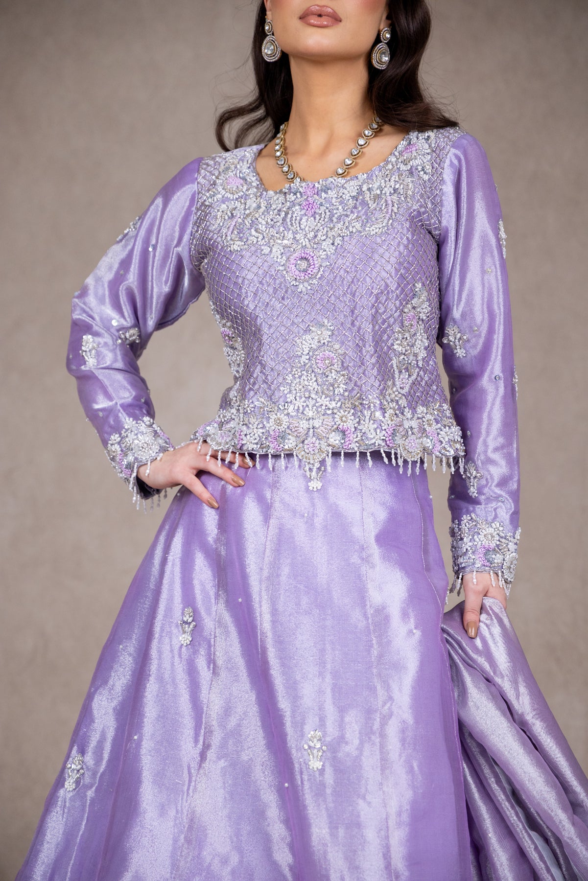 Elevate your formal wardrobe with this exquisite lehnga choli, meticulously crafted on luxurious zari tissue fabric. Every inch showcases intricate hand embroidery that captures light beautifully, creating an enchanting shimmer perfect for weddings and celebrations. The ensemble is completed with a stunning embroidered organza scarf that adds graceful movement and sophistication. This is more than just attire—it's a statement of elegance and timeless craftsmanship that ensures you'll be the centre of attention at any formal occasion.