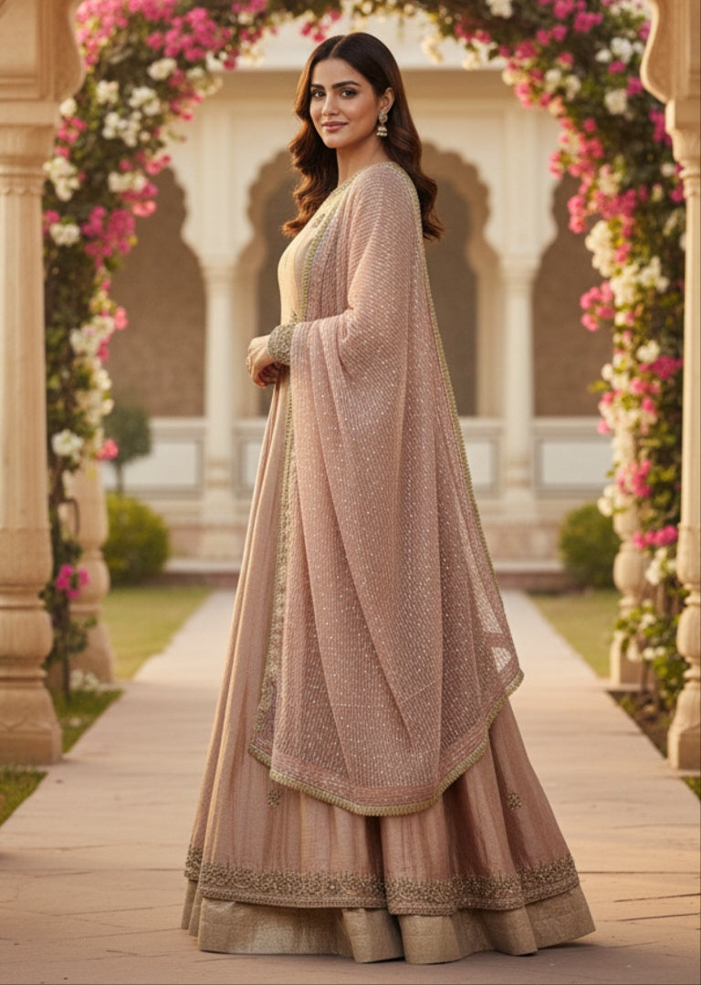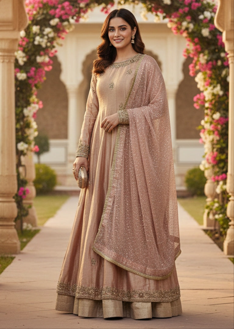 Elevate your formal wardrobe with this stunning jade noir maxi dress, a masterpiece of traditional craftsmanship and contemporary elegance. Crafted from luxurious zari tissue, the dress features intricate handwork that catches the light beautifully, creating an enchanting shimmer perfect for weddings, galas, and special occasions. The flowing maxi silhouette offers graceful movement and timeless sophistication, while the accompanying organza scarf adds an extra layer of refinement and versatility to your ensemble. Each detail has been meticulously executed to ensure you stand out with understated glamour and refined taste. This is more than a dress—it's an investment in timeless style that celebrates artisanal excellence and cultural heritage.