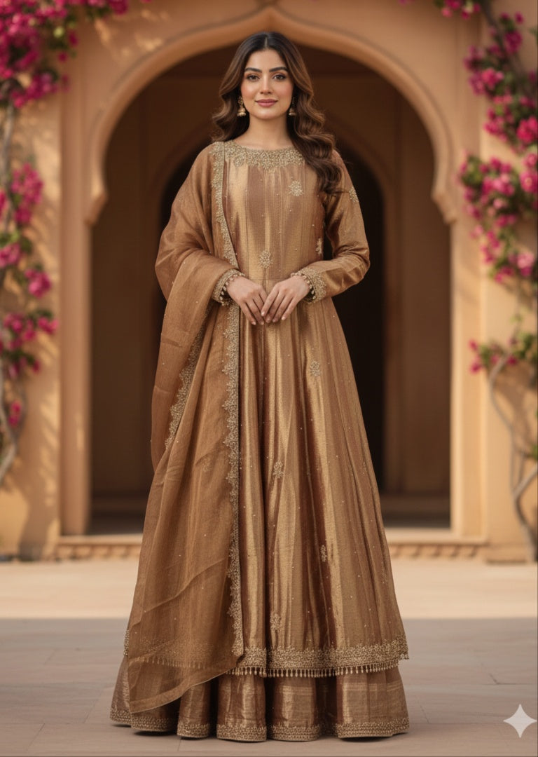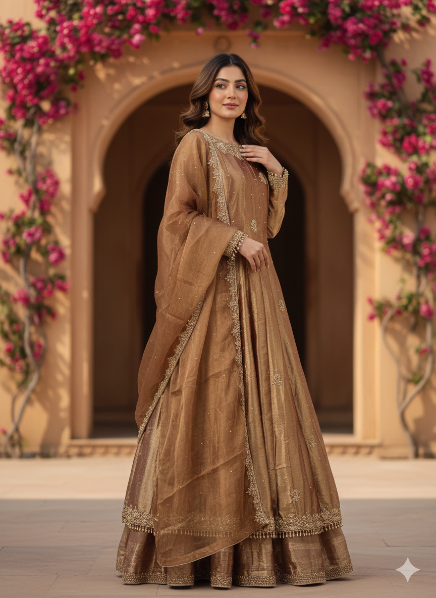 • Fabric: The garment appears to be made from a metallic tissue or silk-blend with a dual-tone "shimmer" effect. The copper-bronze hue has a high sheen that catches the light beautifully.