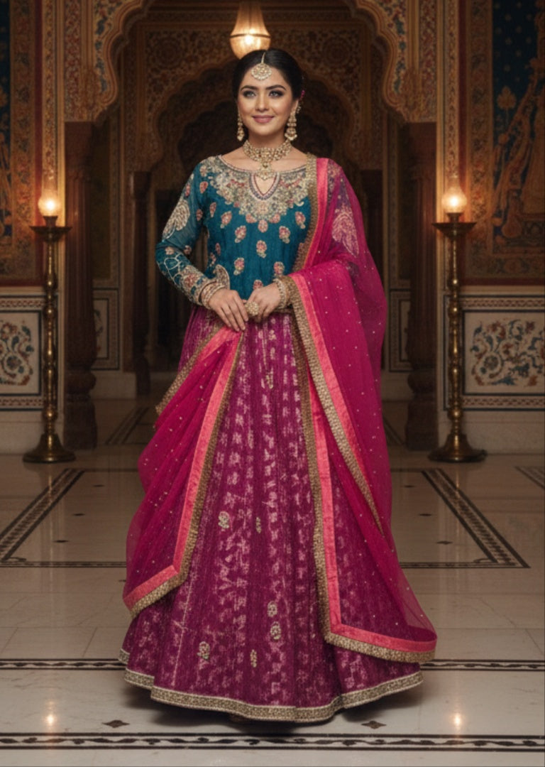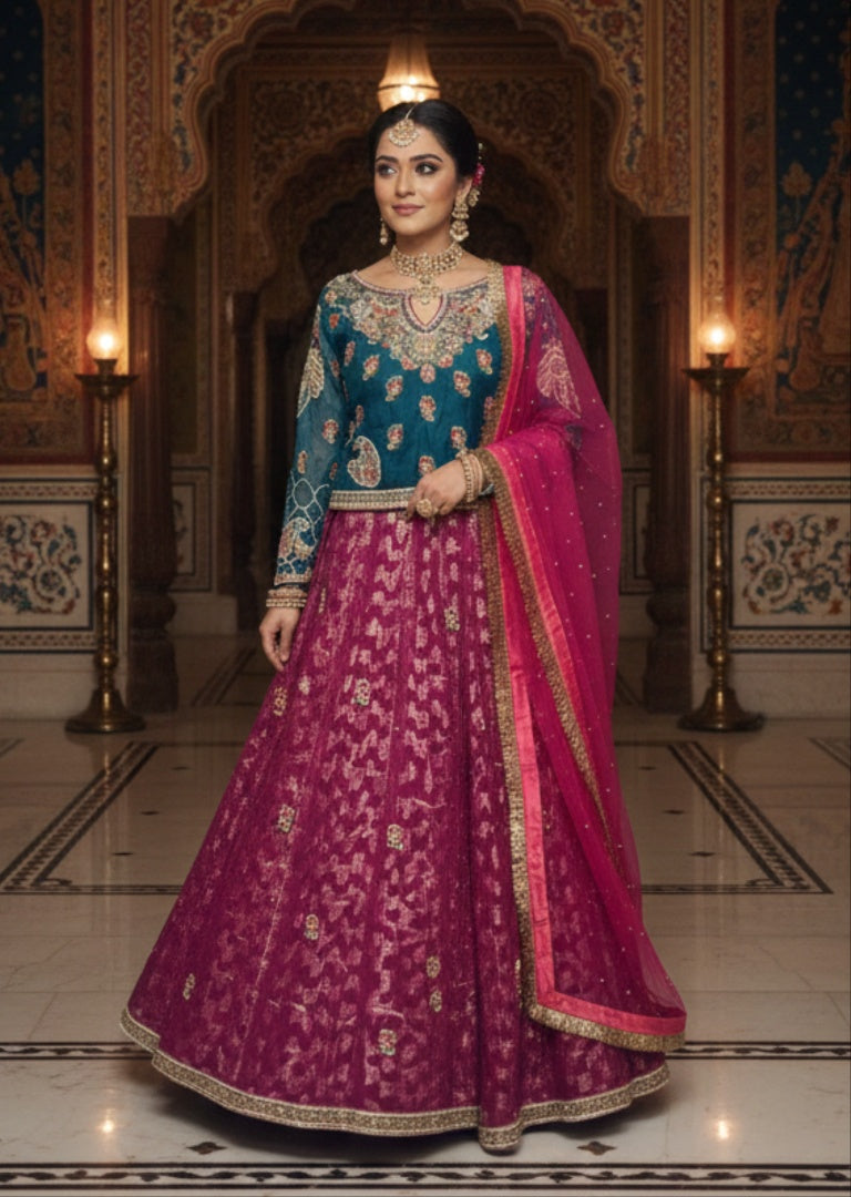Introducing the Diya – an exquisite lehenga choli ensemble that captures timeless elegance. Crafted from luxurious organza, the intricately embroidered top features stunning handwork on both front and back, creating a mesmerizing focal point. The flowing net skirt is beautifully lined with brocade fabric for structure and comfort, while the accompanying net dupatta is adorned with delicate kiran lace detailing on all four sides. Perfect for weddings, celebrations, and special occasions, this sophisticated design seamlessly blends traditional craftsmanship with contemporary style. Elevate your festive wardrobe with this stunning formal piece from Sehrish B.